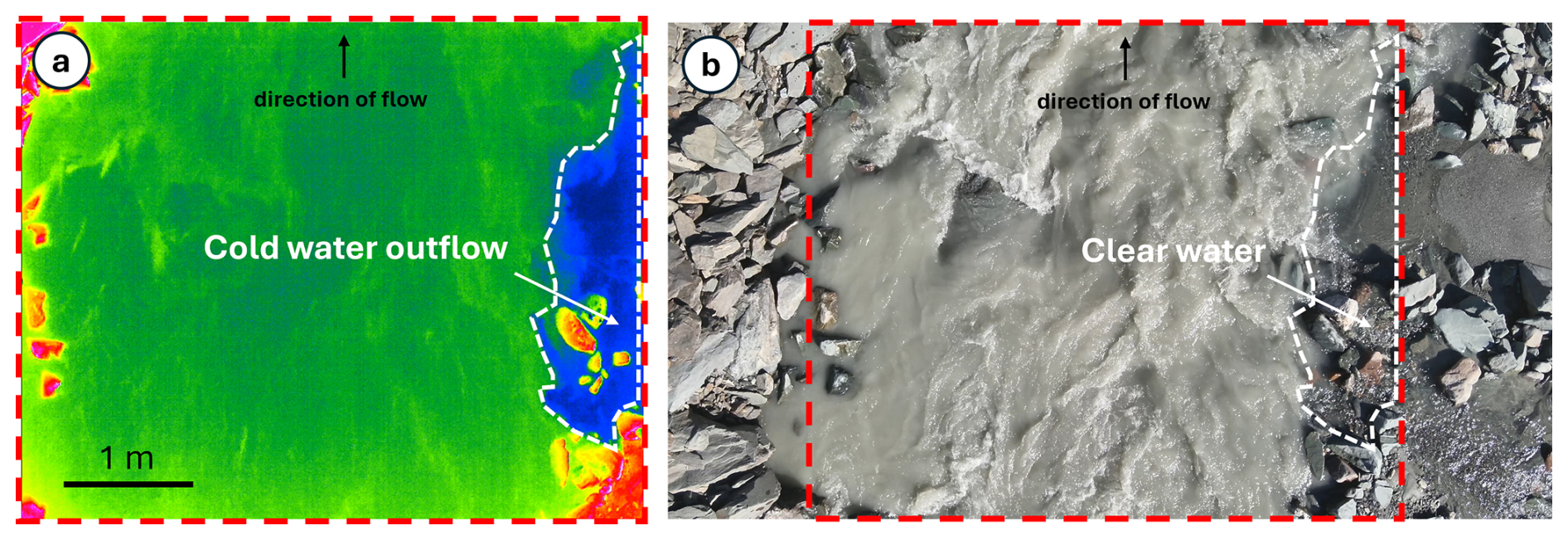 The TIR video was visually analyzed to identify cold water emergence zones using two criteria: (1) a clear contrast between the dominant stream surface temperature and the suspected exfiltration area, with an area larger than 10 cm2, and (2) the presence of a turbulent mixing zone at least 1 m in length immediately downstream of the suspected area (flight data and information are available as supplemental material in Charonnat and Baraer, 2025). Absolute temperatures were not derived due to the absence of a calibrated color scale in the TIR video; instead, detection relied on qualitative identification of relative temperature differences appearing as visual color contrasts in the TIR video – typically, colder areas appeared as blue-toned patches compared to the green-toned stream and red-toned sunlit boulders.