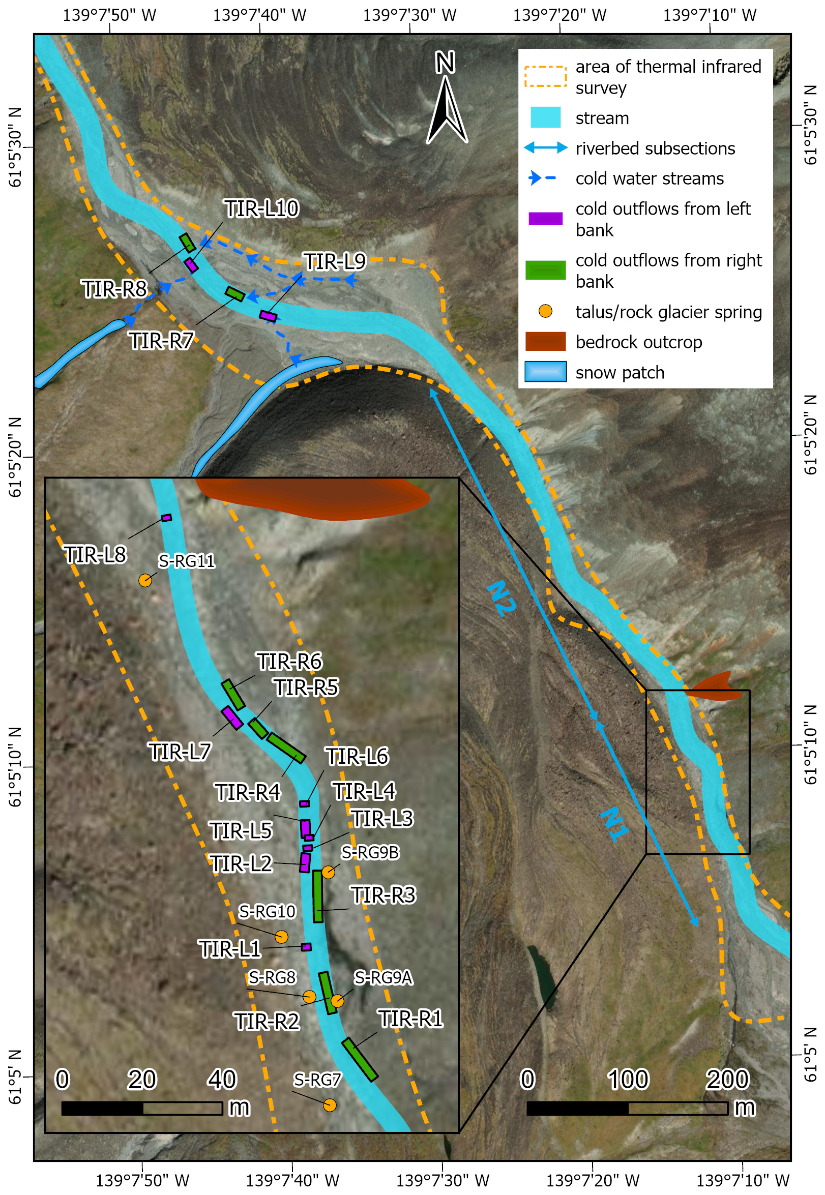 Overall, the drone-based TIR survey revealed a high density of cold water emergence zones along both the left and right banks of the N1 subsection, upstream of the bedrock outcrop. These zones, connected to springs sampled in 2022 and 2023, delineate a significant area of groundwater exfiltration within the upstream half of the “narrow section” of the Shár Shaw Tagà River, where flow is constrained by RG-A1 rock glacier.