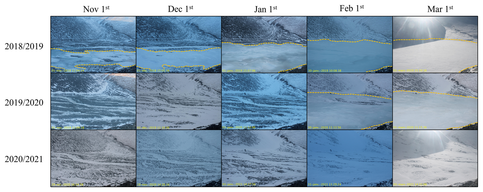 Figure 5Monthly time-lapse images captured by TLC1 of the aufeis from 1 November to 1 March during the winters of 2018–2019, 2019–2020, and 2020–2021. The yellow dashed line indicates the extent of the aufeis in each image when visible. The time-lapse images were selected targeting the closest to the first day of each month, with consideration given to image quality. Note that no aufeis formation occurred during the 2020–2021 winter.