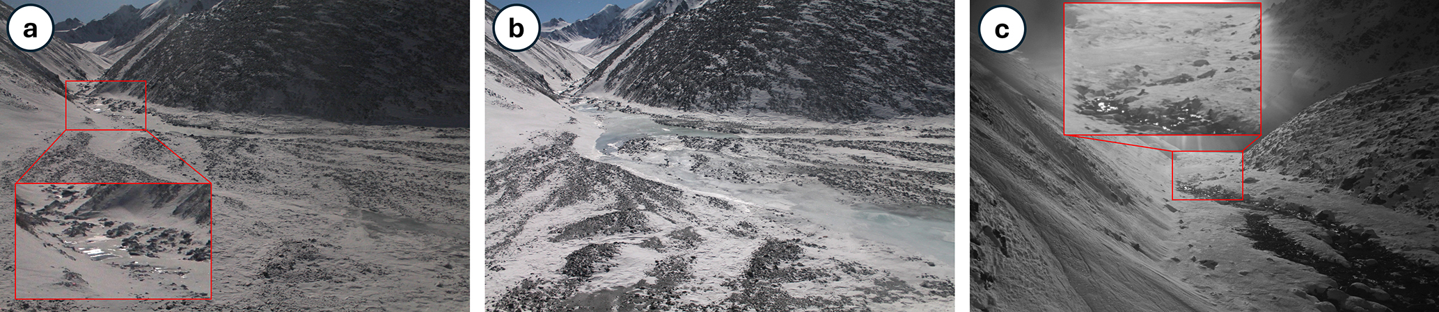 Figure 6Winter outflows in the downstream outwash plain (a, b) and in the N1 subsection (c), captured by TLC2 on (a) 4 January 2020 at 08:00, (b) 8 January 2020 at 11:00, and TLC3 on (c) 22 October 2021 at 13:00. The light in the raw images has been enhanced to improve picture quality. (a) and (b) are oriented towards the end of the N2 subsection and the entrance of the downstream outwash plain, while (c) is oriented towards the N1 subsection and the upstream outwash plain in the background. (a) At 08:00 on 4 January 2020, the aufeis has not yet formed, but reflections of ice and/or liquid water are visible at the end of the N2 subsection, during a time when the Shár Shaw Tagà River is dry. (b) At 11:00 on 8 January 2020, the aufeis has started to form in the outwash plain, extending from the end of the N2 subsection. (c) At 13:00 on 22 October 2021, surface outflow is visible from the entrance of the N1 subsection, but no outflow is visible in the upstream outwash plain in the background.