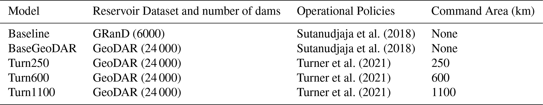 Sutanudjaja et al. (2018)Sutanudjaja et al. (2018)Turner et al. (2021)Turner et al. (2021)Turner et al. (2021)Table 2Shows the model scenarios that we have built and tested for this paper. The first column denotes the name assigned to the model scenario in the results.