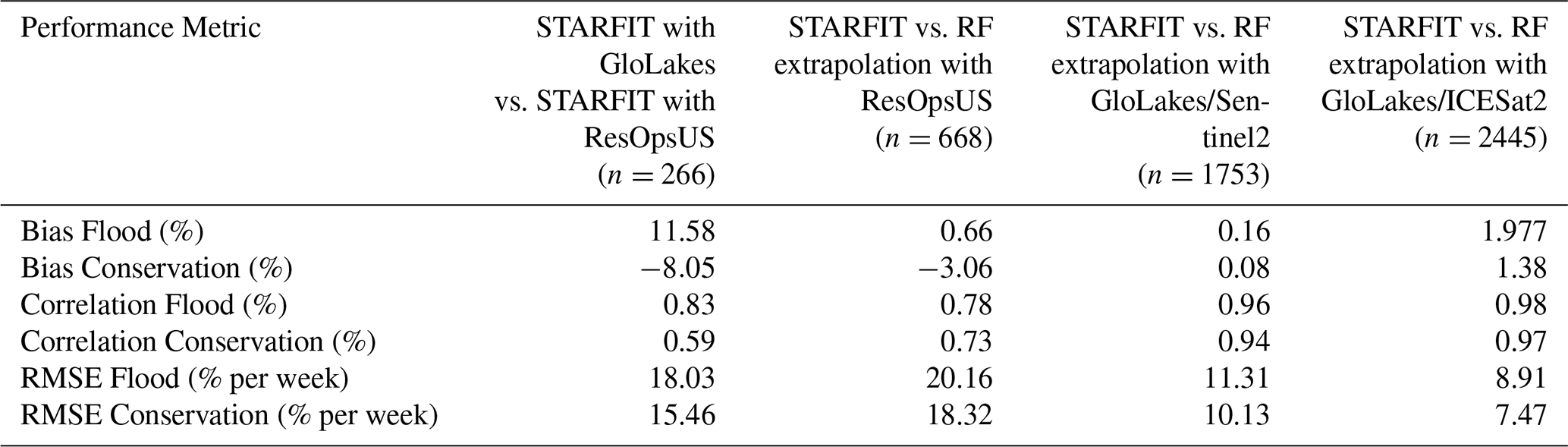 Table 3Depicts the performance metrics (column 1) between the extrapolated curves using the methodology in Fig. 1 and the STARFIT algorithm developed by Turner et al. (2021) to evaluate the impact of changing data and the random forest on the “original curves”. All RMSE values are in the units (% per week). Column two shows the metrics between the original curves derived from STARFIT and the constrained curves using 668 actual storage values from ResOpsUS (Steyaert et al., 2022) in order to evaluate the impact of using GloLakes. Column three depicts the RF workflow vs. the extrapolation using ResOpUS to further evaluate the RF workflow without the error in satellite altimetry. Column four depicts the comparison between the STARFIT curves and the random forest-constrained curves for the 1752 GloLakes dams that could be input into STARFIT and were used to train and validate the RF workflow. Lastly, column five shows the same metrics for another data product in GloLakes using ICESat2. This is used to validate the RF workflow.