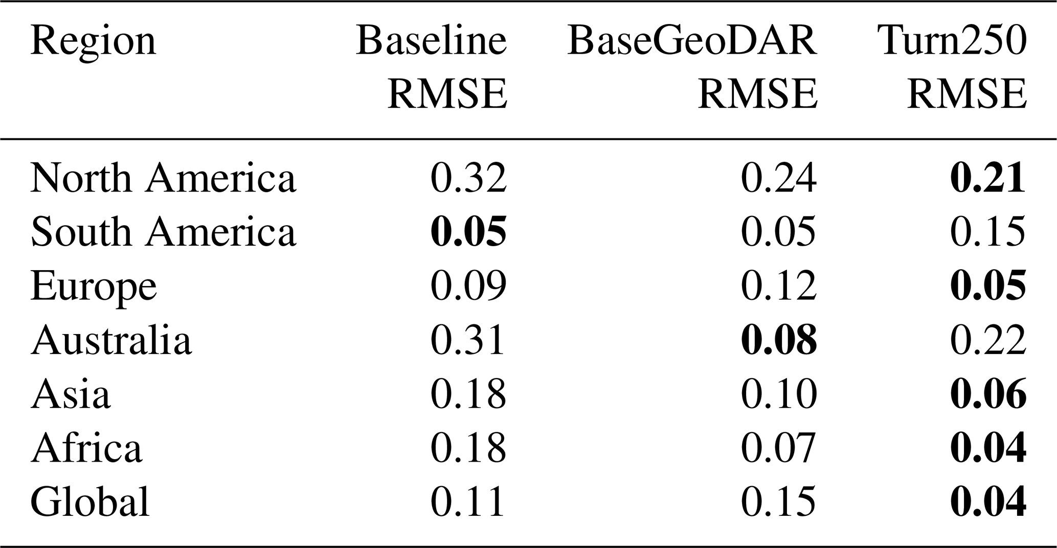 Table A1RMSE between the curves in Fig. 7 for each of the given models (columns) and regions (rows). For this table, we took the GloLakes storage fraction as the observations. For clarity, we depict the best results in bold.
