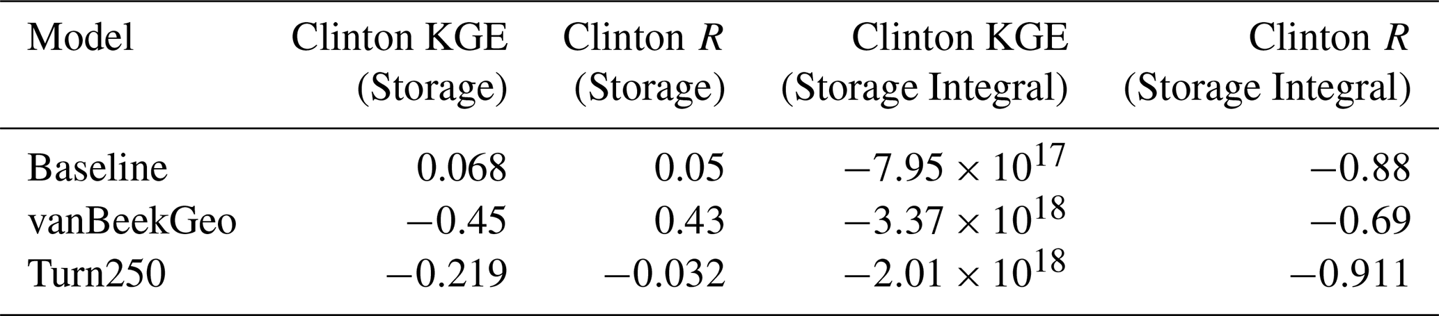 Figure A9Depicts the KGE and RMSE CDFs for the storage evaluation with point location in GloLakes across the United States. The simulated models are depicted in black for Baseline, grey for the vanBeekGeo and pink for Turn250. The dashed pink line denotes the boundary above which the KGE values show significance.
