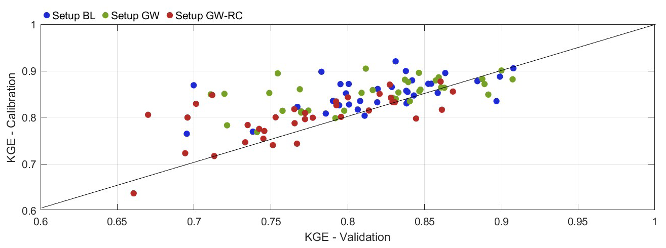 Figure 2Comparison of Kling-Gupta Efficiency values between calibration and validation periods for three configurations. Each point represents a catchment, color-coded by configuration: Configuration BL (blue), Configuration GW (green), and Configuration GW-RC (red). The line represents a one-to-one relationship where calibration and validation KGE values are equal. Points below the line indicate better performance in the validation phase compared to calibration, while those above the line show a decline in performance from calibration to validation.