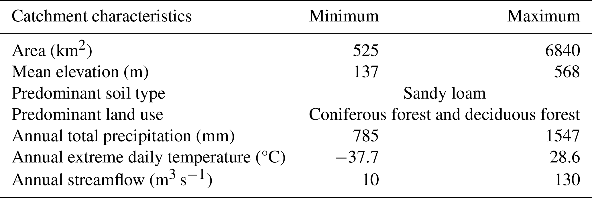 To contextualize the environmental and hydrological setting of the selected catchments, Table 1 presents a synthesis of key descriptors. The table shows the minimum and maximum values for a set of hydrological and geophysical characteristics for each catchment, providing an at-a-glance perspective of the environmental variation within the study area.