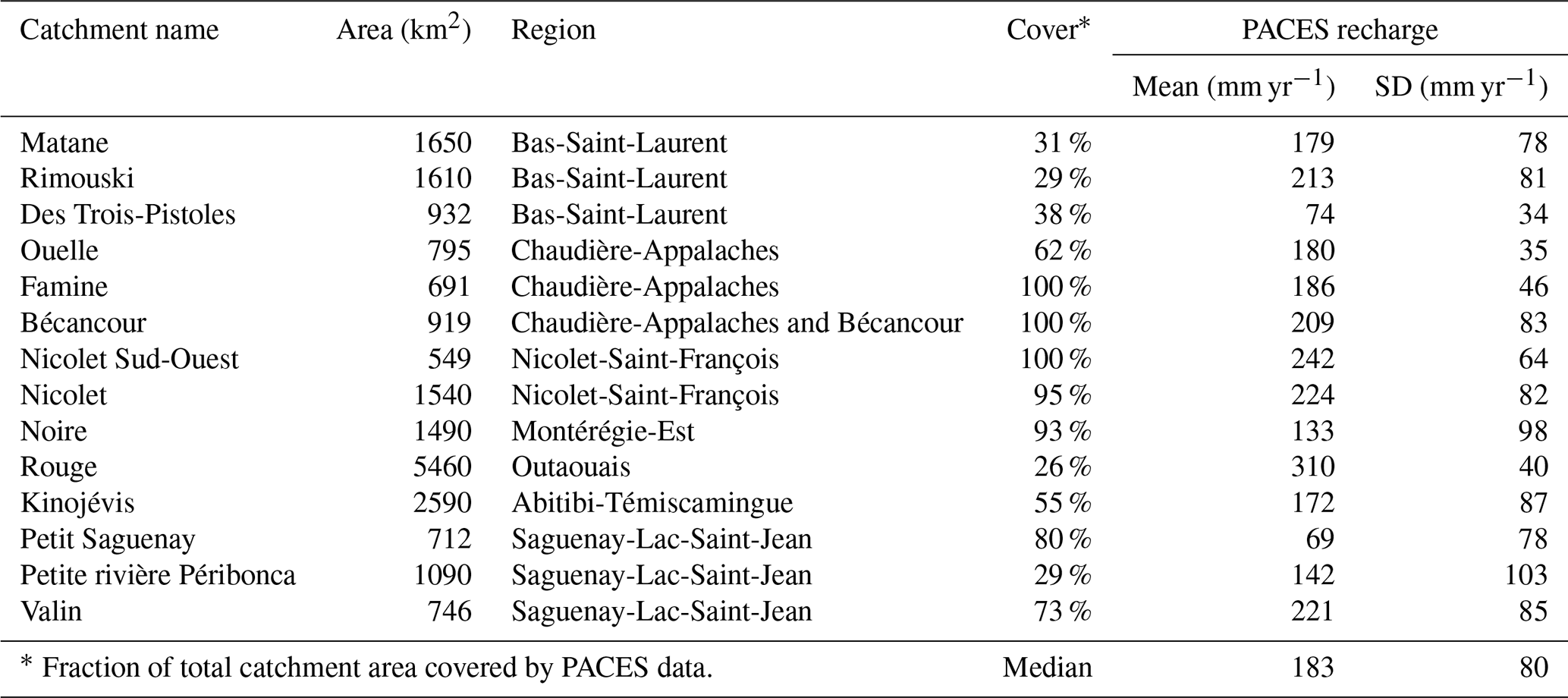 Of the 34 catchments in this study, fourteen were entirely or partially covered by the PACES project. Table 2 lists these catchments, detailing their areas, associated PACES region reports, the percentage of each catchment's area covered by PACES, and the mean and standard deviation of groundwater recharge for the areas covered.