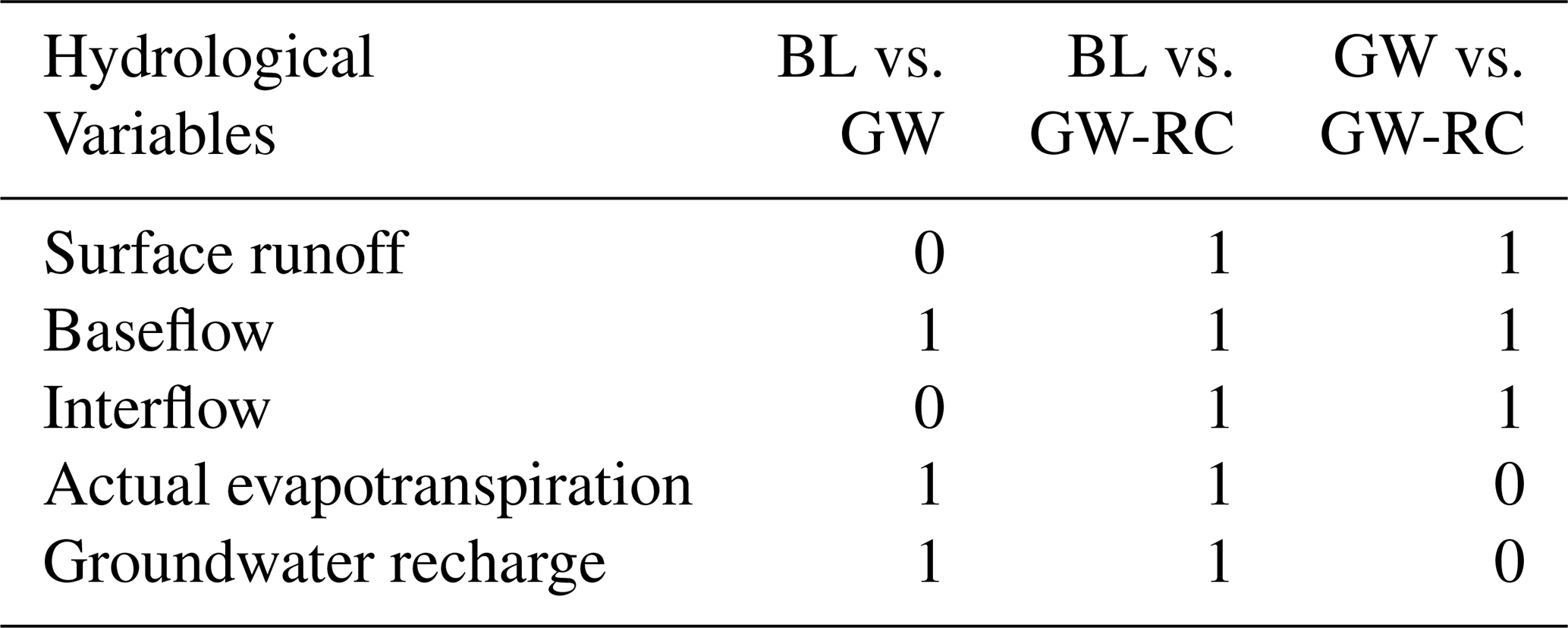 A comparative assessment reveals distinct patterns in the simulated hydrological variables among the configurations. Specifically, configuration GW-RC simulates higher surface runoff and lower interflow, and infiltration compared to configurations BL and GW. Conversely, configuration BL is characterized by higher actual evapotranspiration, lower groundwater recharge, and a higher groundwater level. Configuration GW shares similarities with both configuration BL (in terms of runoff, interflow, and infiltration) and configuration GW-RC (regarding baseflow, groundwater recharge, actual evapotranspiration, and groundwater level).