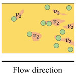 Figure 2Conceptual macroscopically 1D flow through a 1D porous medium column with a mean velocity () containing (very small-scale or pore-scale) lower velocity inclusions (). The Br− ions injected as a pulse into the column are marked with green circles. Calculation of the apparent mean water velocity () at the column outlet will yield a higher velocity than the actual velocity of the transported Br− ions due to the lower velocities experienced by some Br− ions in the inclusions.