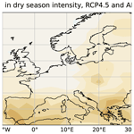 The results from the previous section show profound changes in the European hydroclimate under the different AMOC scenarios. In this section we analyse the dry season responses and its drivers. The dry season length and intensity are shown in Fig. 4. Similar to the PPDday at the end of the year, most European land surfaces display an increase in the dry season intensity under all scenarios (compared to PIon) with the largest increase under the climate change simulations. The responses in the dry season intensity are larger for than for , and larger for RCP8.5 than for RCP4.5. Southern Europe shows the largest changes in dry season intensity.