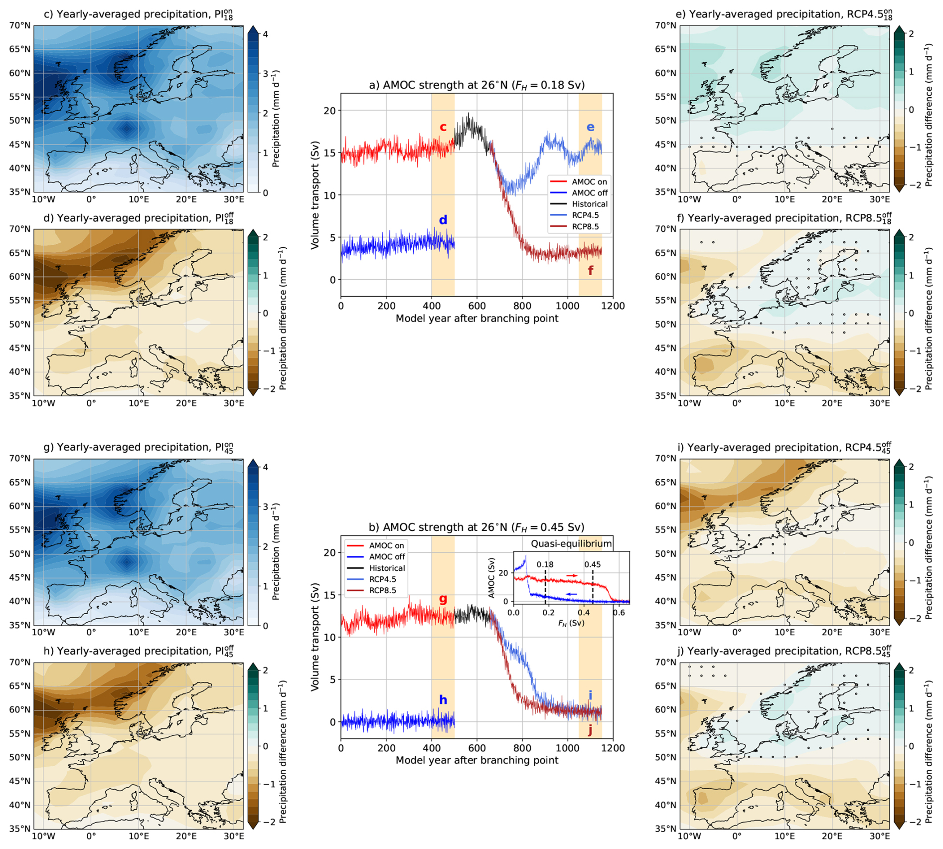 Most results in Sect. 3 below are presented as follows. The scenarios and are the reference cases (for their respective FH values) and we are interested in the hydroclimate responses for the remaining scenarios. The , and are presented as differences compared to . Similarly, the , and are compared to . For example, the yearly-averaged precipitation rates and responses are shown in Fig. 1c–j. These precipitation responses and other hydroclimate responses (see Sect. 3) are quite similar for and , and also for and . This indicates that the hydroclimate responses are robust under PIoff and RCP8.5off, although the different scenarios ( vs. and vs. ) have slightly different AMOC strengths. The most relevant comparison is made between the and , as they have the AMOC in different regimes, which results in opposing precipitation responses (compare Fig. 1e and i). These two RCP4.5 scenarios will be discussed in greater detail as they represent the hydroclimate under intermediate climate change with AMOC strengths compared to present-day values () and under intermediate climate change in combination with a collapsed AMOC ().