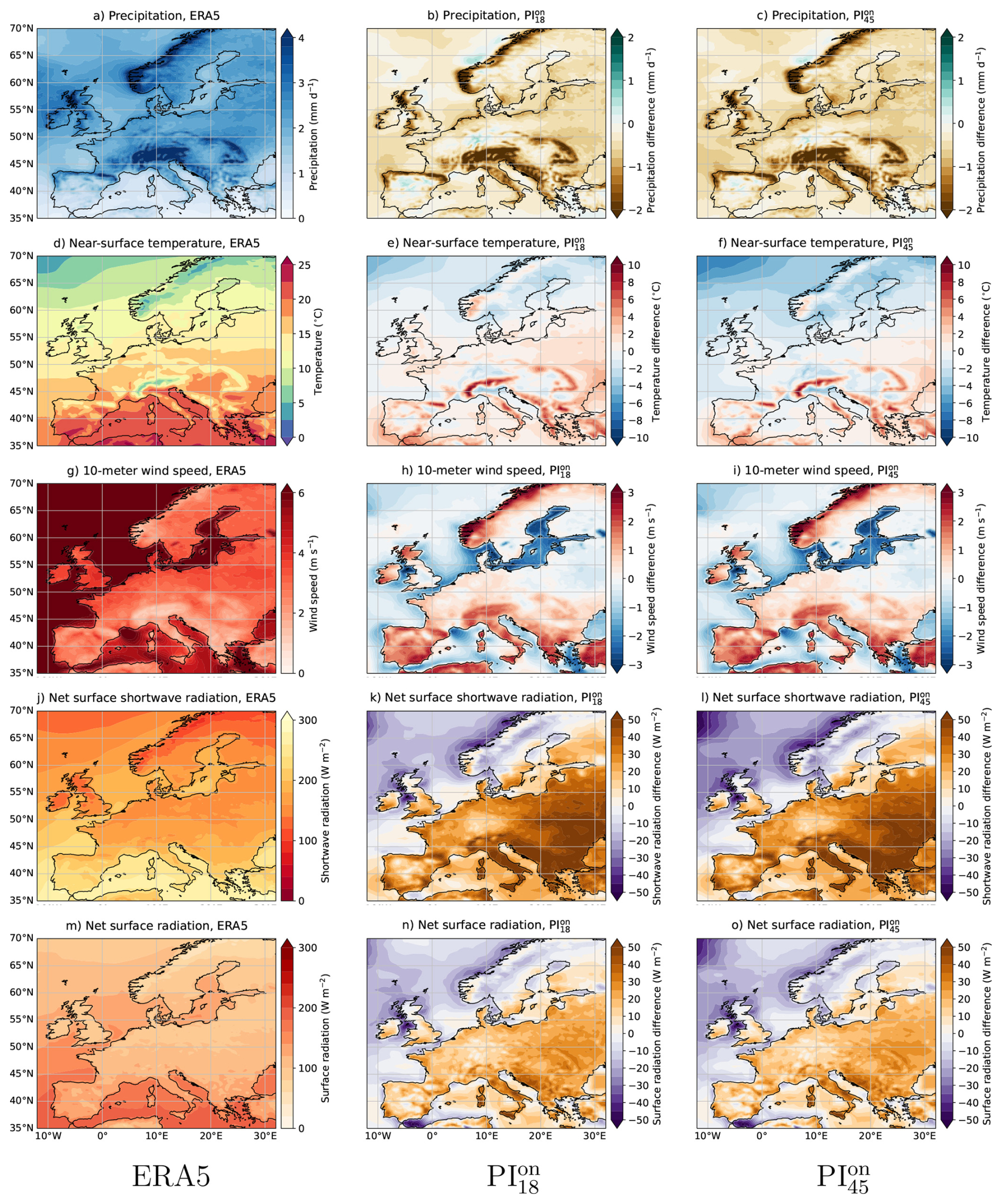 Figure A2The precipitation, near-surface (2 m) temperatures, 10 m wind speed, net surface shortwave radiation, and net surface radiation for ERA5 (1981–2023), and . The climate variables are determined over the growing season (April–September). For the PIon scenarios, the climate variables are displayed as the difference compared to ERA5.