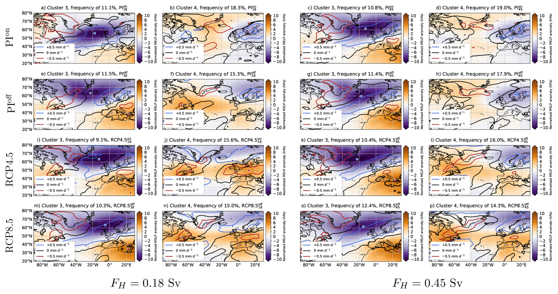 The two clusters induce negative precipitation anomalies over Northwestern Europe for all AMOC scenarios. The differences in the precipitation anomalies, ΔP1,2, are relatively small over the European continent. Although it appears that these two atmospheric regimes become effectively wetter over the European continent compared to PIon. A westward displacement of the MSLP maximum and more frequent cluster 1 for (Fig. 8i) induce drier conditions over the North Atlantic Ocean. In summary, the typical weather regimes do not change much in their overall pattern nor frequency, but small spatial variations may results in a slightly different precipitation anomaly patterns compared to the PIon scenario.