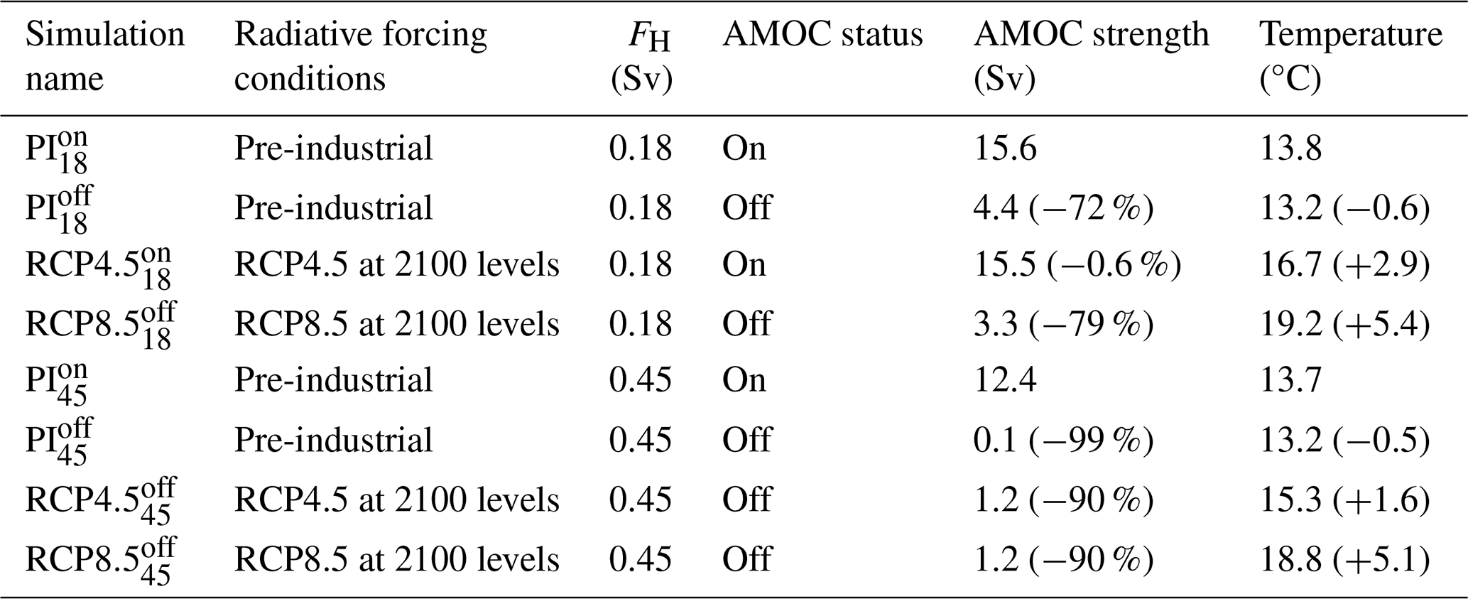 Table 1Overview of the eight different AMOC scenarios simulated with the CESM, including their radiative forcing conditions, freshwater flux forcing strength, AMOC status, time-mean AMOC strength at 26° N and 1000 m depth (expressed in Sverdrups, 1 Sv ≡ 106 m3 s−1), and time-mean global mean surface temperature (change). The time means are determined over 100 year periods.
