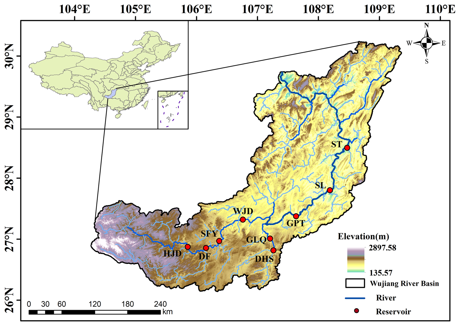 The Wujiang River is the largest tributary on the southern bank of the upper reaches of Yangtze River, and it is characterized by a considerable natural elevation drop and abundant hydropower resources. The Wujiang River Basin has a catchment area of 87 920 km2, a length of 1037 km, a natural fall of 2124 m, and a subtropical wet monsoon climate. The integral role of this basin in the “West–East Electricity Transmission” project establishes its prominence as the critical basin among the 13 major hydropower bases of China (Wu et al., 2018). The cascade reservoir system of the Wujiang River Basin in this study comprises nine reservoirs with varying shapes, surface areas, and regulation capacities. The Wujiang River exhibits relatively stable annual runoff. The Hongjiadu (HJD) Reservoir in the upstream section acts as the “leading reservoir” of the selected cascade reservoir system and offers multi-year regulation capability. The midstream Wujiangdu (WJD) Reservoir provides annual regulation, whereas the downstream Goupitan (GPT) Reservoir supports multi-year regulation. Figure 1 illustrates the spatial distribution of reservoirs in the Wujiang River Basin. After the gradual completion of the cascade system in the basin, more sediment has accumulated. As a result, during long-term operation, the storage capacity of the nine-reservoir cascade system has decreased to varying degrees, which negatively affects the operation and scheduling of the reservoirs (Yuan et al., 2022; Yuan and Xu, 2018).