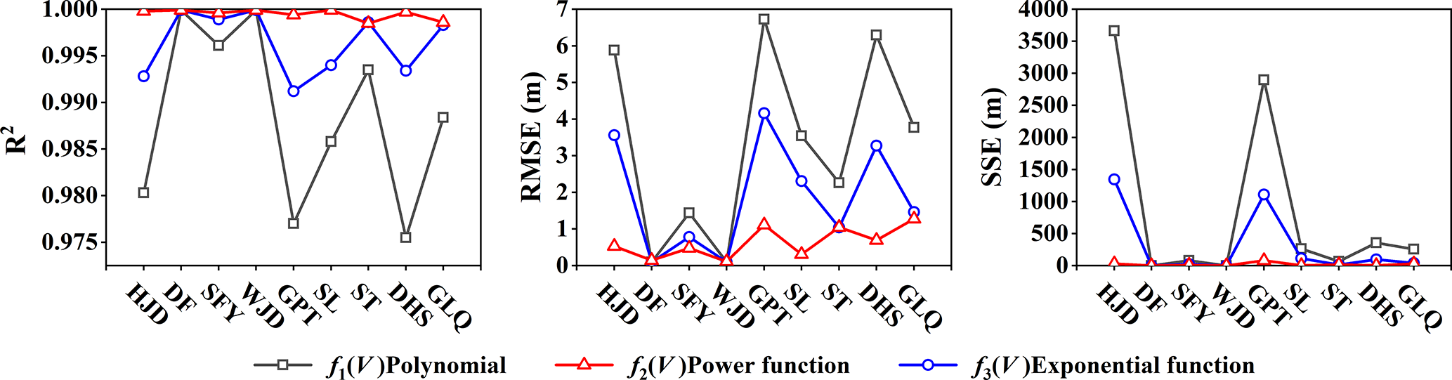 To assess the goodness–of–fit of nonlinear models f1, f2, and f3 compared with discrete data points of reservoir water levels and storages, we used three typical statistical indices: the coefficient of determination (R2), sum of squared error (SSE), and root mean square error (RMSE) (Eqs. 5–7).