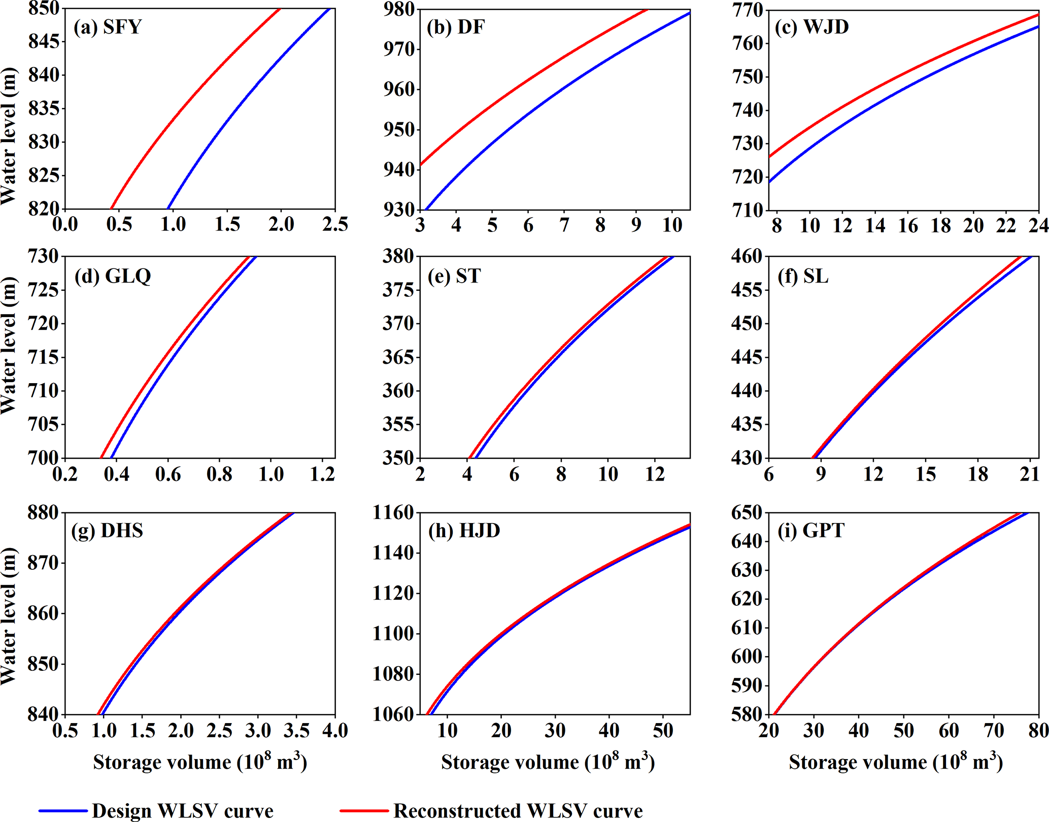 The Suofengying, Dongfeng, and Wujiangdu reservoirs, located in the upper reaches of the Wujiang mainstream, had more serious sediment accumulation, which significantly changed the capacity, with LR values over 25.02 %, 12.96 %, and 10 %, respectively. The higher correlation between the water storage changes generated from reconstructed WLSV curves in this study and those based on the water balance and DEM data demonstrates that the estimated WLSV curve with sediment accumulation is suitable for use.