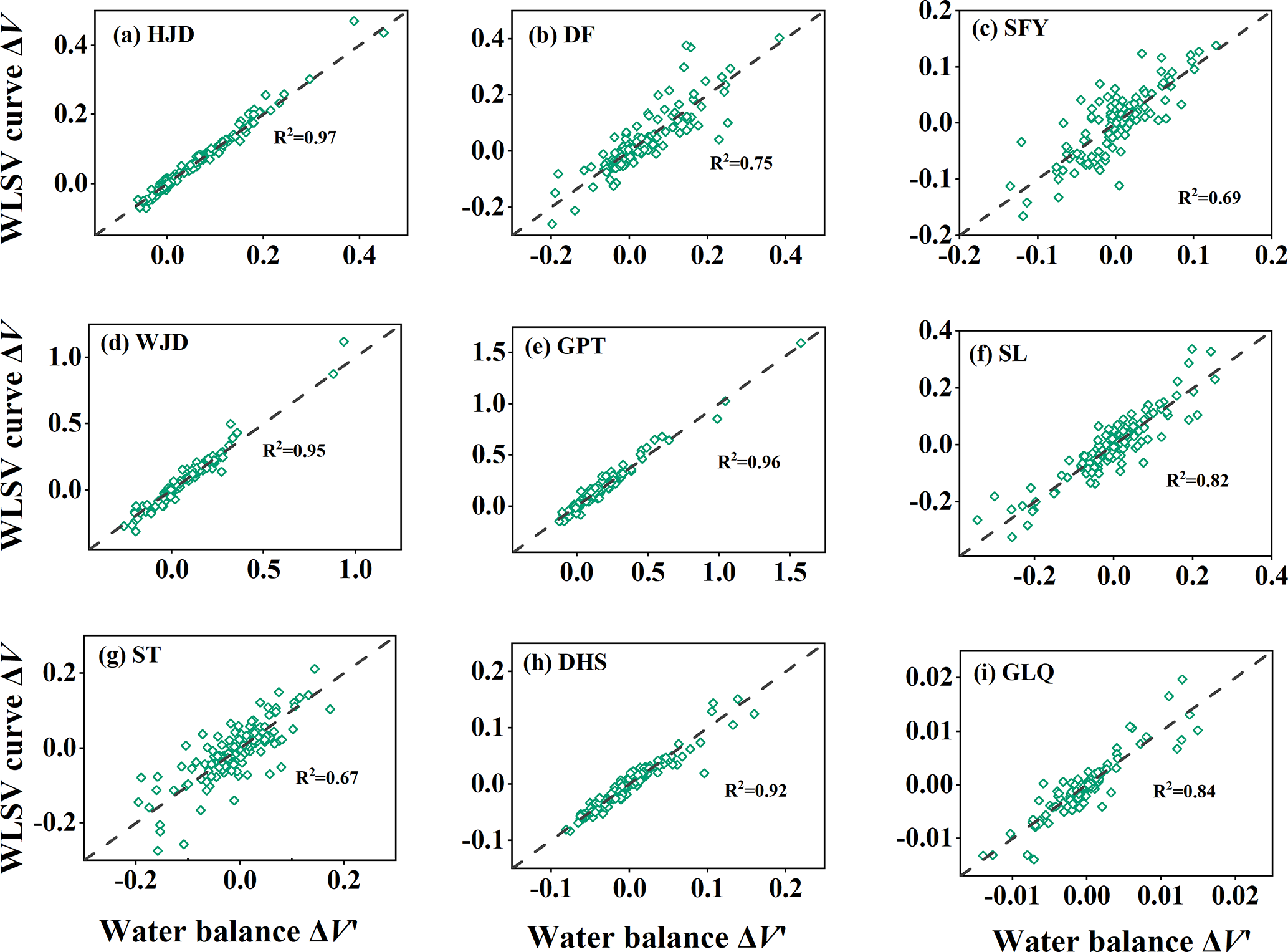 Figure 7Correlation between the storage changes generated from sediment accumulation and water balance budgets (108 m3) for nine reservoirs in this study.