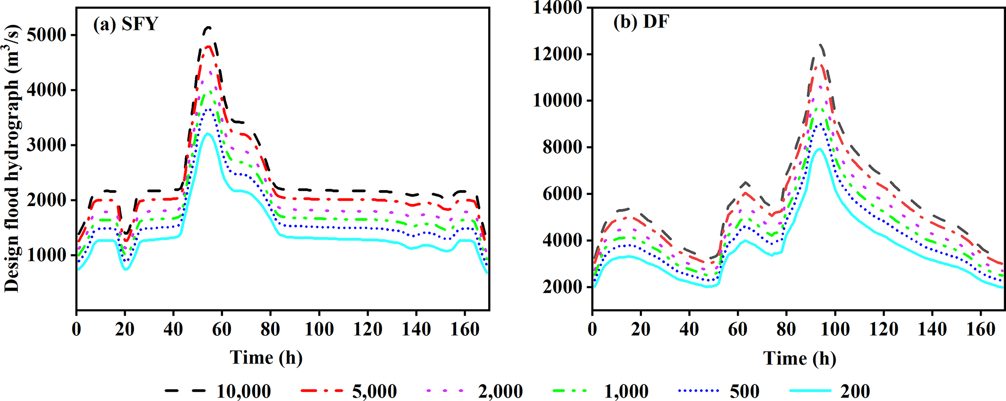 Figure 9Design flood hydrographs for each frequency at the SFY and DF reservoirs (return periods: 200, 500, 1000, 2000, 5000, and 10 000).