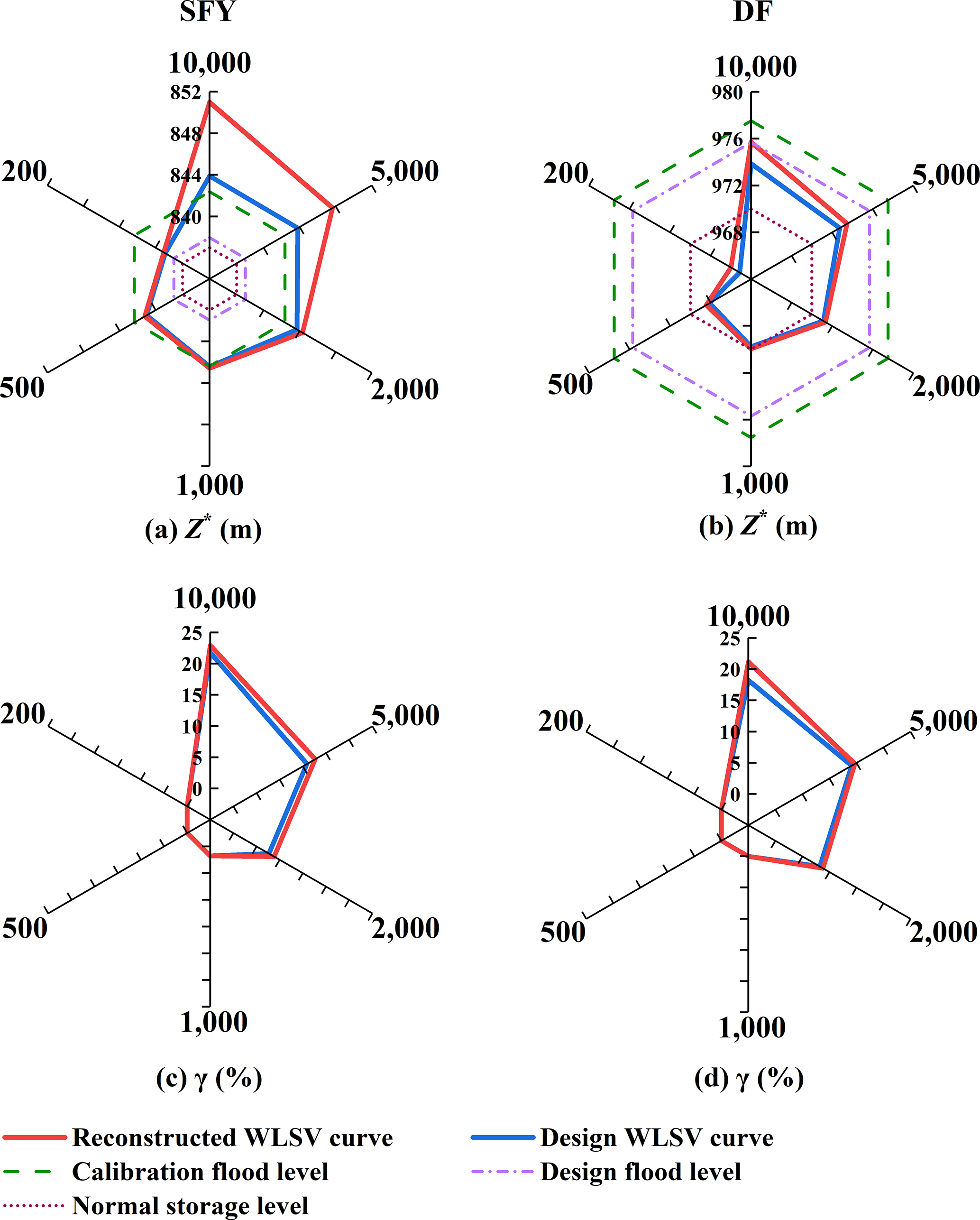The current design WLSV curve for flood regulation calculations underestimated the maximal water level during flood regulation (Z*) and the duration of regulation beyond the characteristic water level (γ). The underestimation increases with the return period of the design flood. For the Suofengying and Dongfeng reservoirs, the underestimation of Z* increased from 0.20 and 0.86 m for the 200-year return period to 6.75 and 1.84 m for the 10 000-year return period. Thus, when the storage capacity significantly decreases, continued use of the existing design WLSV curve may significantly underestimate the flood regulation risks and pose potential safety hazards to the reservoir and downstream flood protection objects.