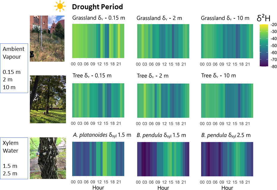 Terrestrial vegetation plays a critical role in regulating water and energy fluxes (Asbjornsen et al., 2011; Bernacchi and VanLoocke, 2015). These fluxes are driven by the ecohydrological dynamics of atmospheric vapor and tree-internal water transport, which are essential for assessing evapotranspiration (ET) patterns, water-limiting conditions, tree function, and groundwater recharge (Dubbert and Werner, 2019; Stevenson et al., 2025; Wang et al., 2017). Despite their importance, these water cycling processes have rarely been investigated on sub-daily scales over prolonged periods mainly due to measurement constraints (Warix et al., 2023; Penna et al., 2018; Meili et al., 2021). Differentiating between morning, afternoon and nighttime temporal patterns, including source water partitioning of water fluxes such as hydraulic redistribution, transpiration cycling and relative humidity gradients brings a novel perspective to ecohydrology (Nadezhdina et al., 2010; Konarska et al., 2016; Kim et al., 2021; Stevenson et al., 2023). Seasonal changes, along with alternating wet and dry periods (DWD, 2022a), are of additional importance for a holistic understanding of water regimes in vegetated landscapes. In particular extreme events like summer droughts and subsequent autumn rewetting remain poorly understood at sub-daily scales, limiting insight into tree water use (Marx et al., 2022). As a result, how these sub-daily dynamics evolve over the growing season and affect water cycling has yet to be fully elucidated to predict further impact of climate variability on vegetation water fluxes (Seeger and Weiler, 2021; Ring et al., 2024).