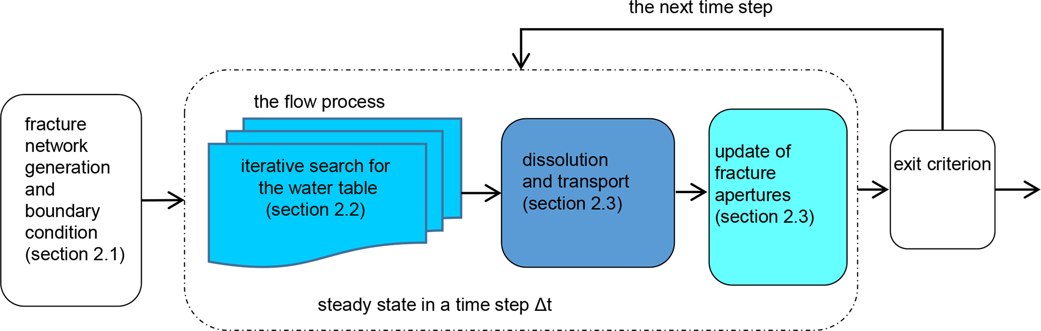 Models of fracture networks' karstification necessitate the integration of flow, dissolution, and transport processes within the system, while adhering to specified hydraulic and hydrochemical boundary conditions. In our research, we simulate the evolution of a stochastic fracture network under constant recharge and fixed head boundary conditions. The computational procedure is shown in flowchart of Fig. 2 and outlined as follows:
