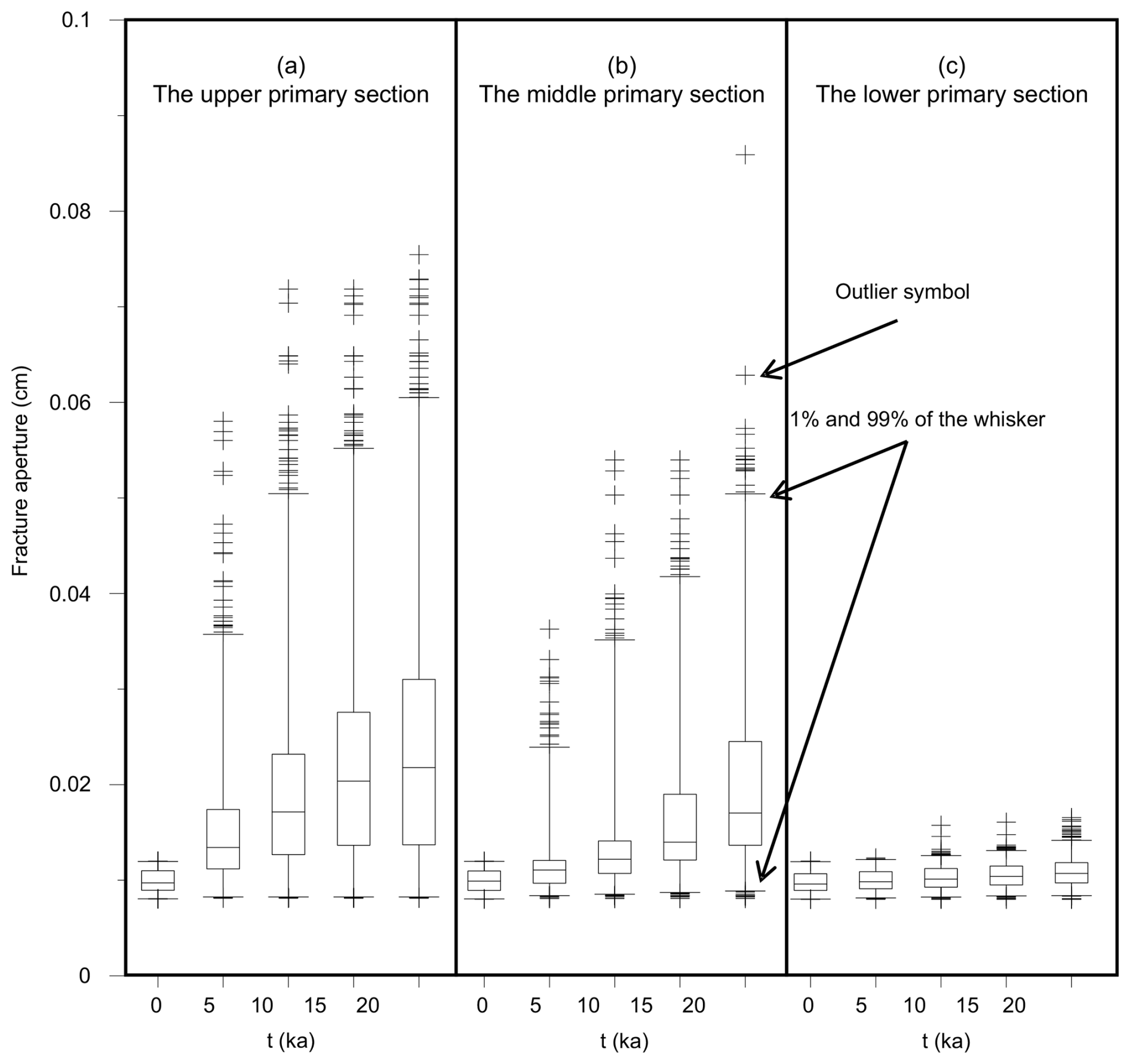 The fracture aperture distributions at three evolution time steps are shown in Fig. 6. To facilitate the discussion, we have divided the aquifer into 15 subsections along three vertical primary sections, as shown in Fig. 5a. The variation of aperture statistics in three vertical sections is shown in Fig. 7. The water table with dissolution fringe mainly descends through the upper section, which experience the evident change in aperture (Gabrovšek and Dreybrodt, 2001; Hubinger and Birk, 2011).