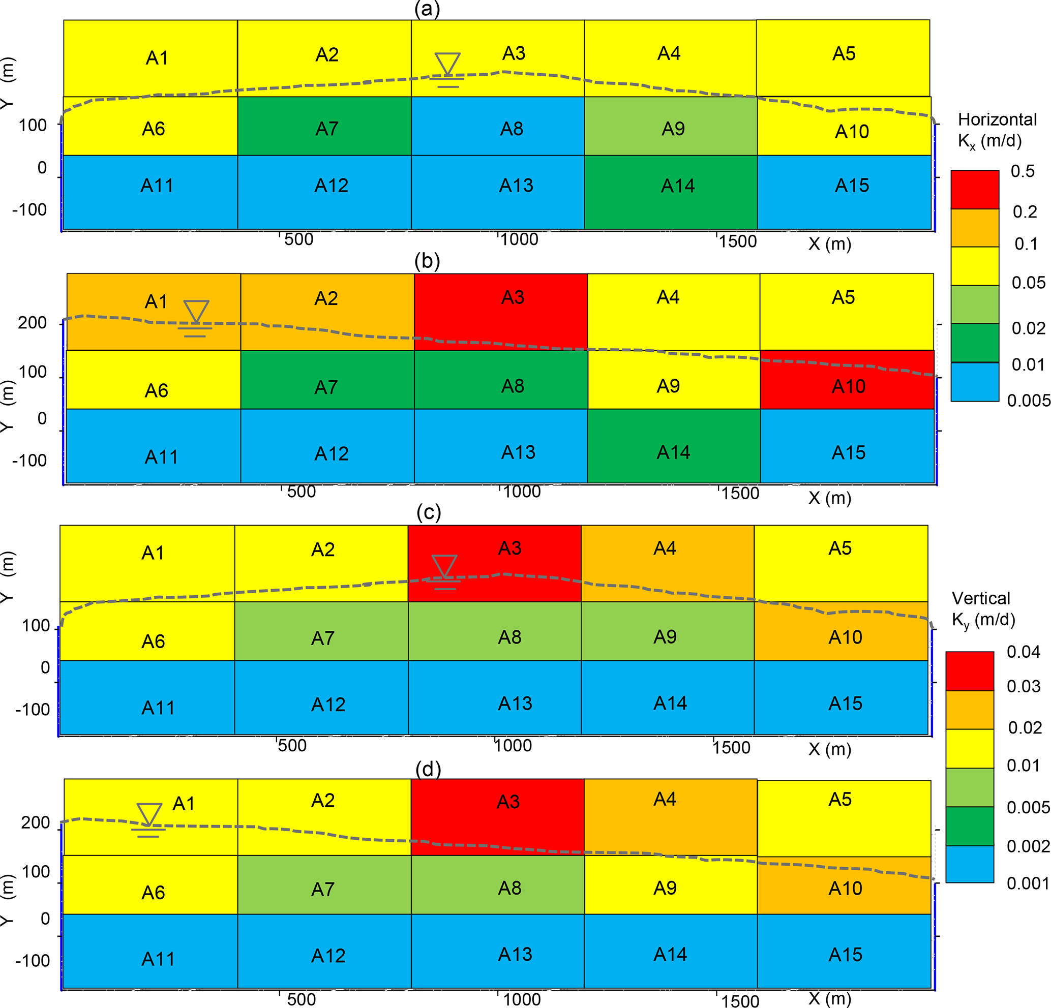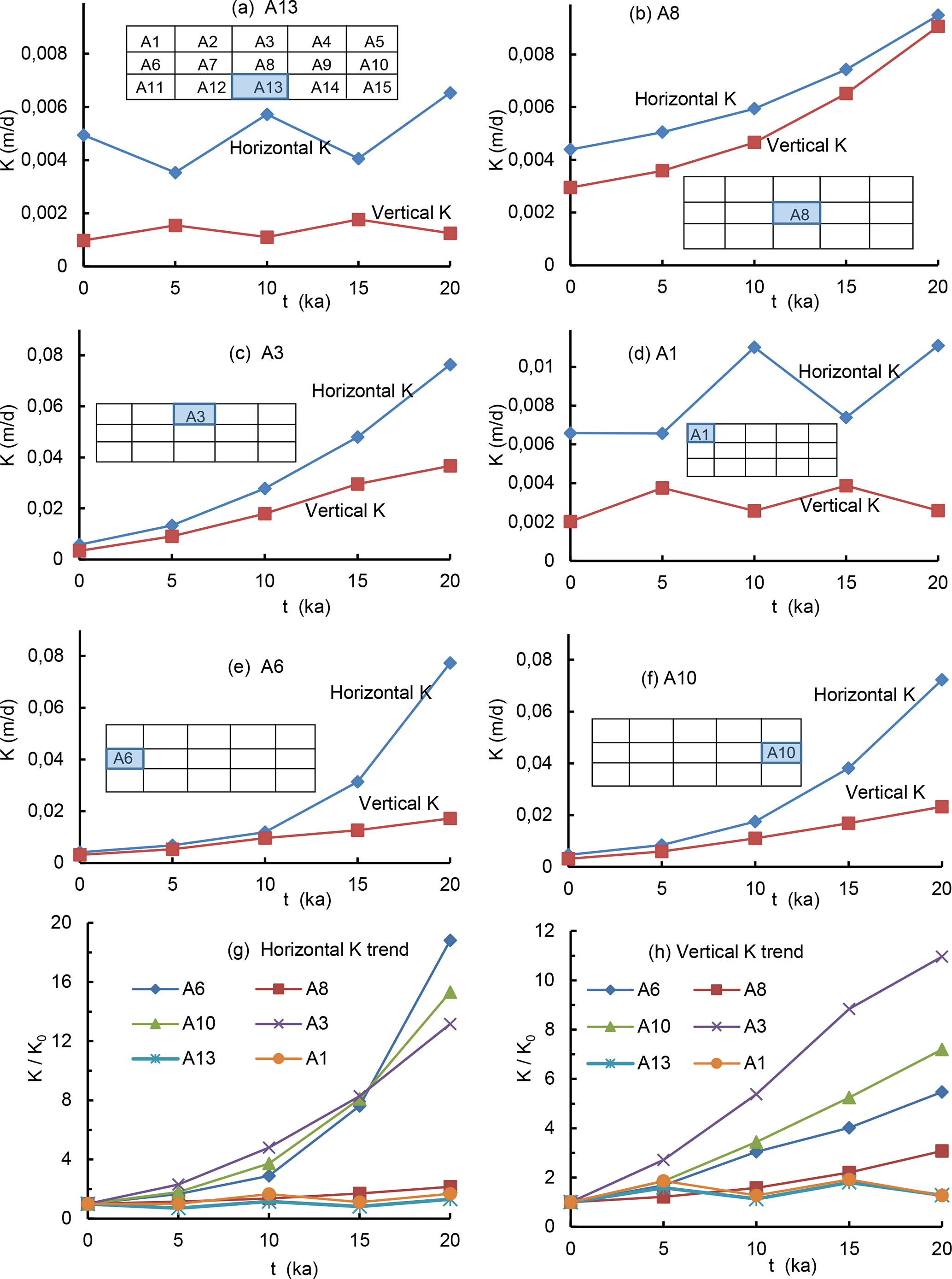 To further elucidate the formation of an LKB, we calculated vertical and horizontal hydraulic conductivity in each subsection. To do this, we “cut out” a section at certain stage of evolution, and calculated confined flow rate for a given head difference along horizontal and vertical direction, respectively. Thus horizontal and vertical equivalent K values, and the changes and trends in the representative subsection were computed (Fig. 9). Notably, the fractures below 50 m in the lower subsections (A11 to A15), remained unevolved. The horizontal K varied between 0.005 and 0.008 m d−1 in the different subsections, and the vertical K varied between 0.001 and 0.002 m d−1.