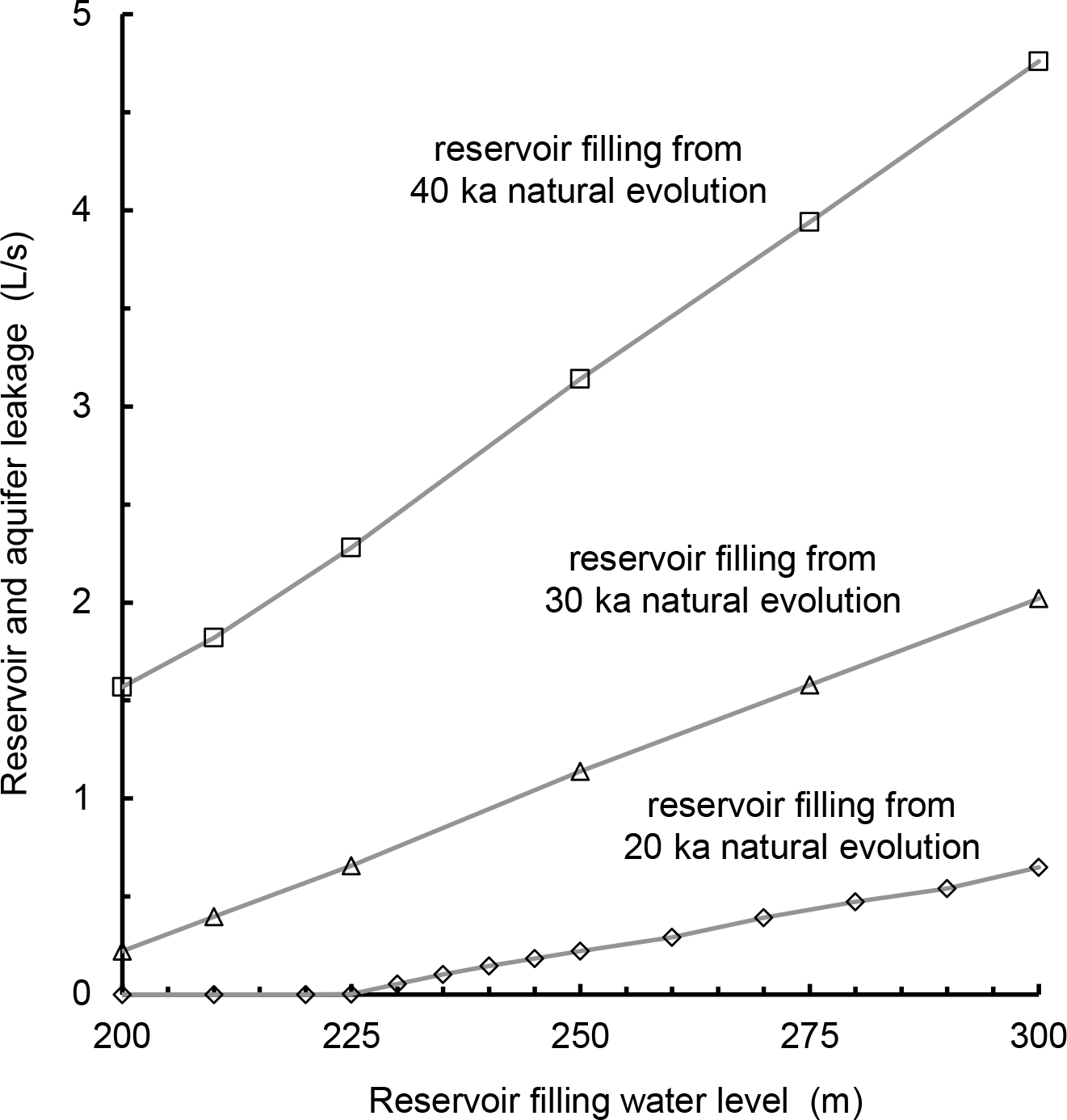 Figure 11 shows the reservoir leakage at different water levels through the aquifer at different stage of evolution, assuming the lateral width of the aquifer is 100 m. For the aquifer after 20 ka of evolution under rainfall recharge, no leakage is observed below 225 m, as the water divide is still present and high enough to drive water from the aquifer to the reservoir. For 30 and 40 ka “old aquifers”, leakage is present at all levels applied and increases linearly with the reservoir level. The actual water level of the Geheyan reservoir is 200 m, which is below the level, where significant leakage may be expected from the model.
