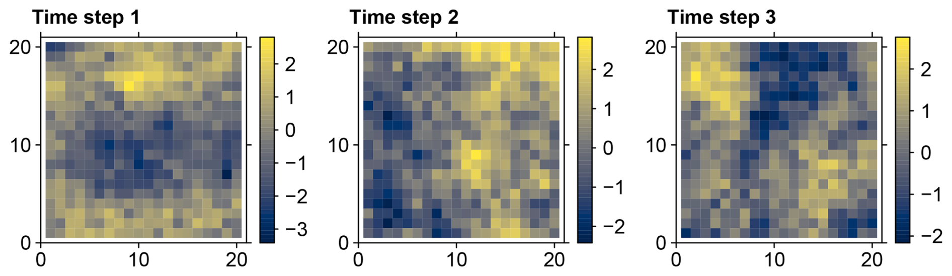 The synthetic data sets consist of synchronous spatially distributed time series exhibiting spatial but no temporal autocorrelation. Each data set is produced by concatenating realizations of a random field with identical spatial correlation properties (Fig. 2). The grid cells (cells) of the random field represent the locations of a data set. The spatial autocorrelation is defined with a spatial covariance model. Each realization of the field represents one instant of time of a data set. Thus, at each location the respective time series consists of a sequence of random numbers. The number of field realizations gives the length of the simulated time series. The random fields were simulated with the “RandomFields” package (Schlather et al., 2015, 2020).