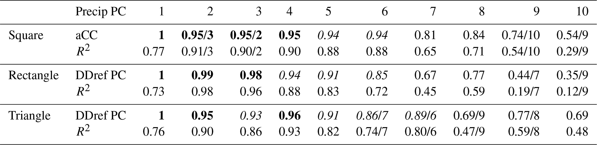 Table 1Best matches between the DD patterns of the square, rectangular and triangular domains from the homogeneous subsampling variant (Hom40) (Fig. 10) and the patterns formed by the corresponding subsets from their all cells (AC) counterpart. That is, the AC patterns (Fig. 8a to c) clipped with the coordinates of the Hom40 variant (Fig. 10a to c), quantified by the absolute values of the Congruence Coefficient (aCC) and R2. Mostly, the best matches were of identical PC rank. If the best match was with an AC pattern subset of different rank, that rank is given after the “/”. Hom PC: PC ranks from the Hom40 variant. Bold aCC values indicate PC patterns that can be considered equal; italic aCC values indicate fairly similar PC patterns (Sect. 3.3).