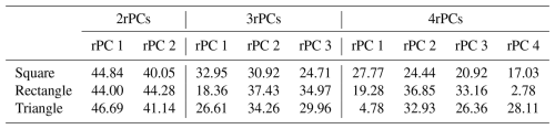 PCs with ambiguous orientation of spatial patterns are more likely to occur for symmetric domain shapes than for asymmetric ones (North et al., 1982). The basic geometric domain shapes used here exhibit rotational symmetry of order 4 (square), order 2 (rectangle) and order 1 (triangle). Order 1 means no rotational symmetry. Accordingly, within the range of the analysed time series lengths the number of PCs that exhibited unstable spatial patterns differed between the domain shapes (square: 8, rectangle: 5, triangle: 2 in Fig. 7). Unstable spatial PC patterns are indicative for effectively degenerated multiplets and will be discussed in Sect. 4.4.