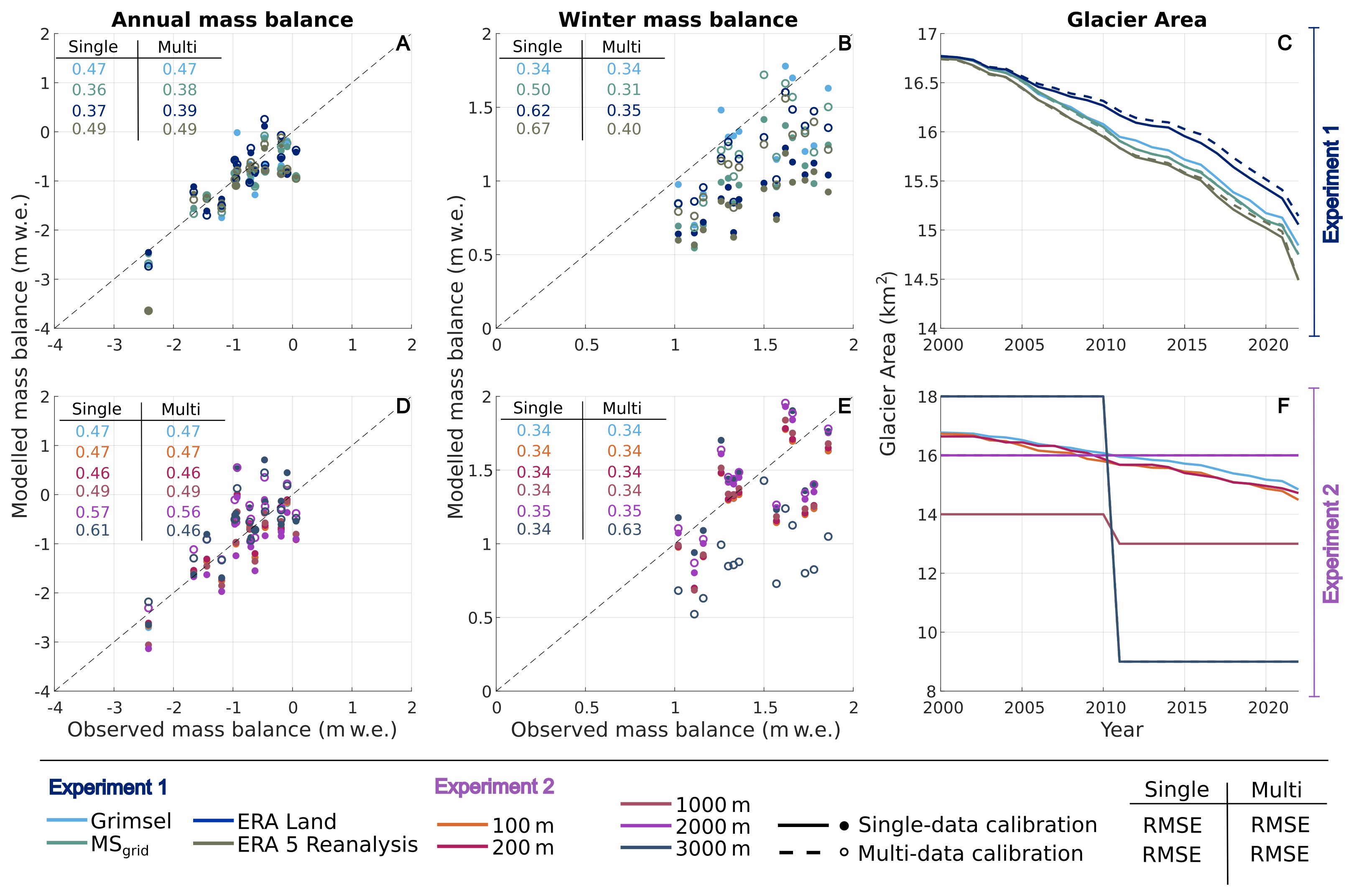 Figure 5Simulated versus observed glacier mass balance for both annual (A, D) and winter (B, E) periods from 2007 to 2022. (A–C) Impact of different meteorological forcing products (Experiment 1). (D–F) Effect of varying model spatial resolutions (Experiment 2). The inset tables provide the RMSE (m w.e.) of the computed glacier mass balances for both single- and multi-data calibration. (C, F) Glacier area evolution from 2000 to 2022. For Experiment 2 (spatial resolutions from 25 to 1000 m), both mass balance and glacier area were identical for single- and multi-data calibrations.
