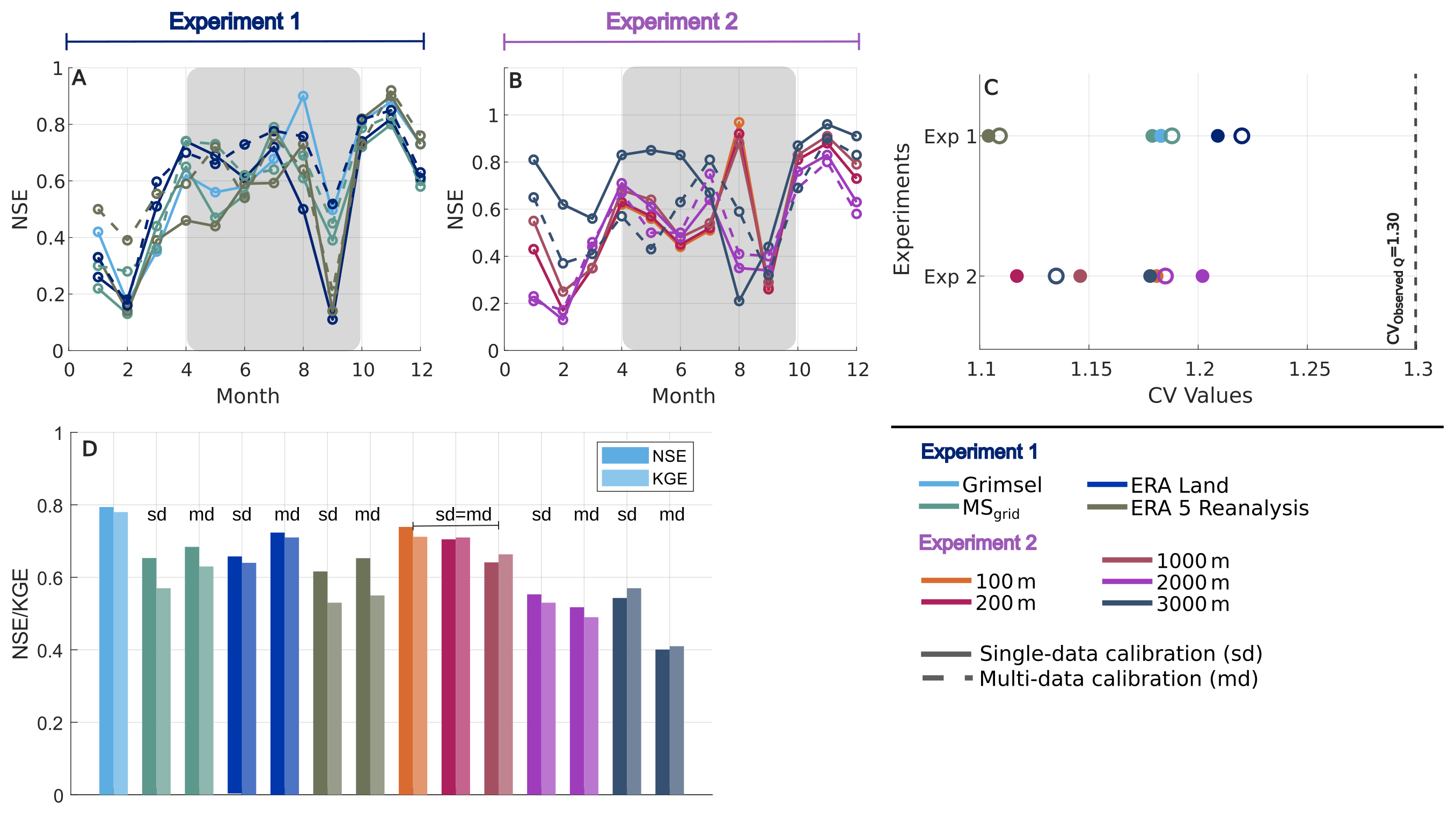 Figure 7(A, B) Monthly NSE values for each experiment. Grey-shaded areas indicate the melt season (April–September), which is considered for model evaluation. This period aligns with the time of year when glacier- and snowmelt-driven runoff dominates. Winter runoff values are excluded due to both their high uncertainty and their limited contribution to annual discharge. (C) CV of the annual runoff sums for the two experiments, distinguishing between single- (empty dots) and multi-data (filled dots) calibration. Observed runoff CV of 1.30 is indicated with a dashed vertical line. (D) Annual NSE (left bar) and KGE (right bar) for each simulation. sd indicates a simulation performed with the single-data calibration, md with the multi-data calibration. For model resolutions finer than 2000 m, NSE, KGE and CV remain consistent across both calibration methods.