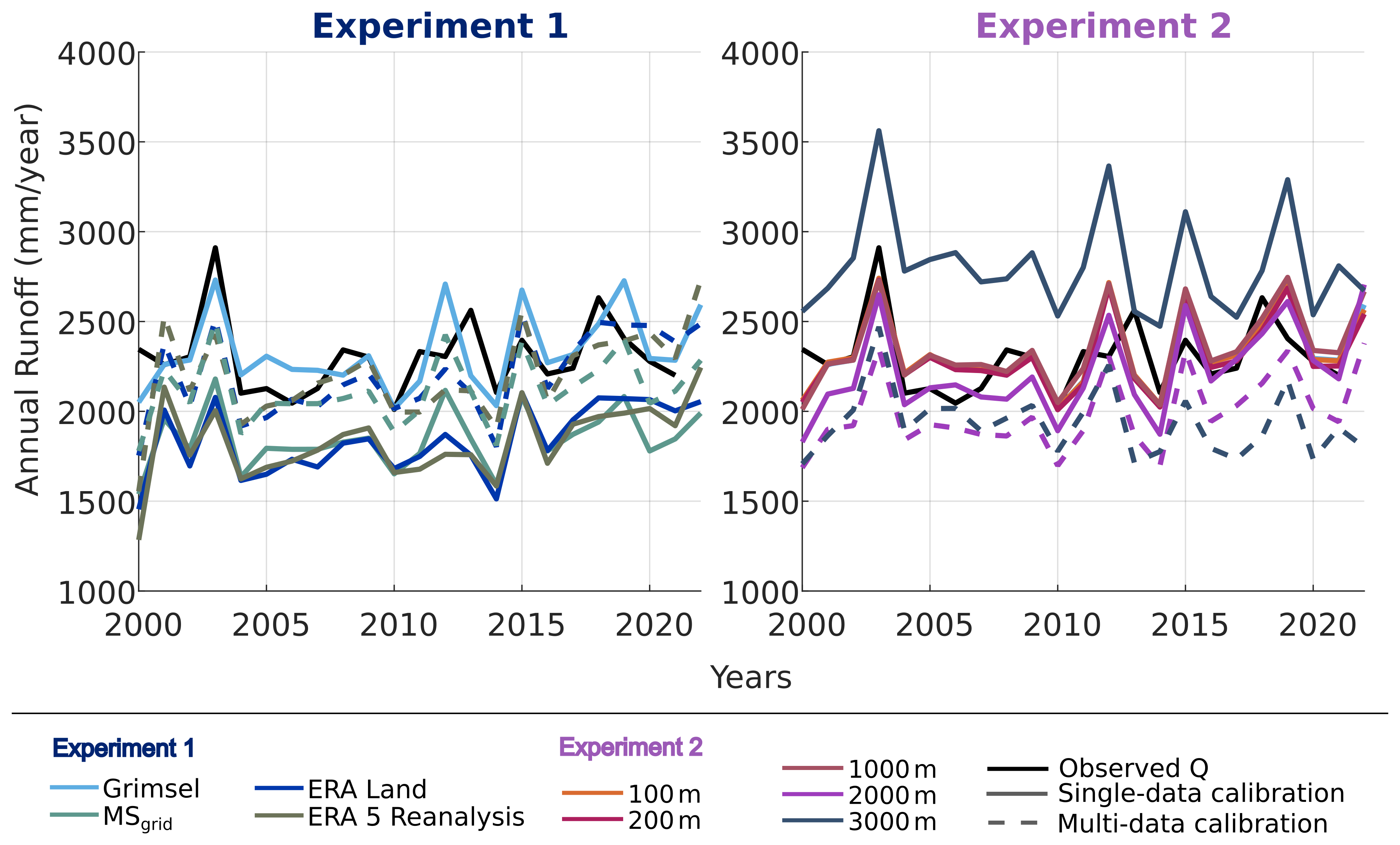 Figure 8Annual catchment runoff observed and simulated using different (A) forcing products and (B) model resolutions. Simulations calibrated with the single-data (solid lines) and with the multi-data (dashed lines) calibration scheme are distinguished. For model resolutions < 2000 m, the annual runoff results are independent of the calibration method.