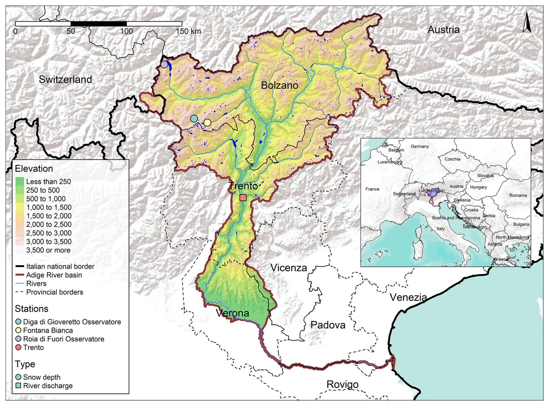 Climate is affected by the basin orography and is characterised by cold and dry winters with rainfall maxima occurring during summer in the upstream part where elevation ranges from 0 to 3905 m above sea level (). At higher altitudes, significant water resources accumulate during the winter season in the form of snowfall (Bertoldi et al., 2023), which are mobilised during spring/early summer determining a snowmelt-dominated hydrological regime (average discharge of 371 m3 s−1 in June in Trento over the last 14 years; Floods.it, last access: 10 March 2025). At lower altitudes, in the downstream plains, streamflow shows a pluvial regime with two peaks: one in autumn, mainly driven by intense cyclonic precipitation, and another one in spring/early summer, primarily due to snowmelt(average discharge of 310 m3 s−1 in June and of 295 m3 s−1 in November at Boara Pisani over the last 14 years; Ambiente Veneto, last access: 10 March 2025). As a mountain basin where glaciers and snowmelt mainly contribute to streamflow during late spring and summer, the system is highly sensitive to drought and temperature shifts: the combination of low snow cover in winter, increasing temperatures in early spring, early snow melting altering the timing of runoff, and intense heatwaves in summer can lead to widespread impacts across multiple environmental and socio-economic sectors. Beyond the climatic drivers, competing water demands for irrigation, hydropower production, tourism, and ecosystem services add further complexity to the dynamics of water availability. These demands, particularly in downstream areas, can intensify impacts and give rise to resource conflicts (Chiogna et al., 2016).