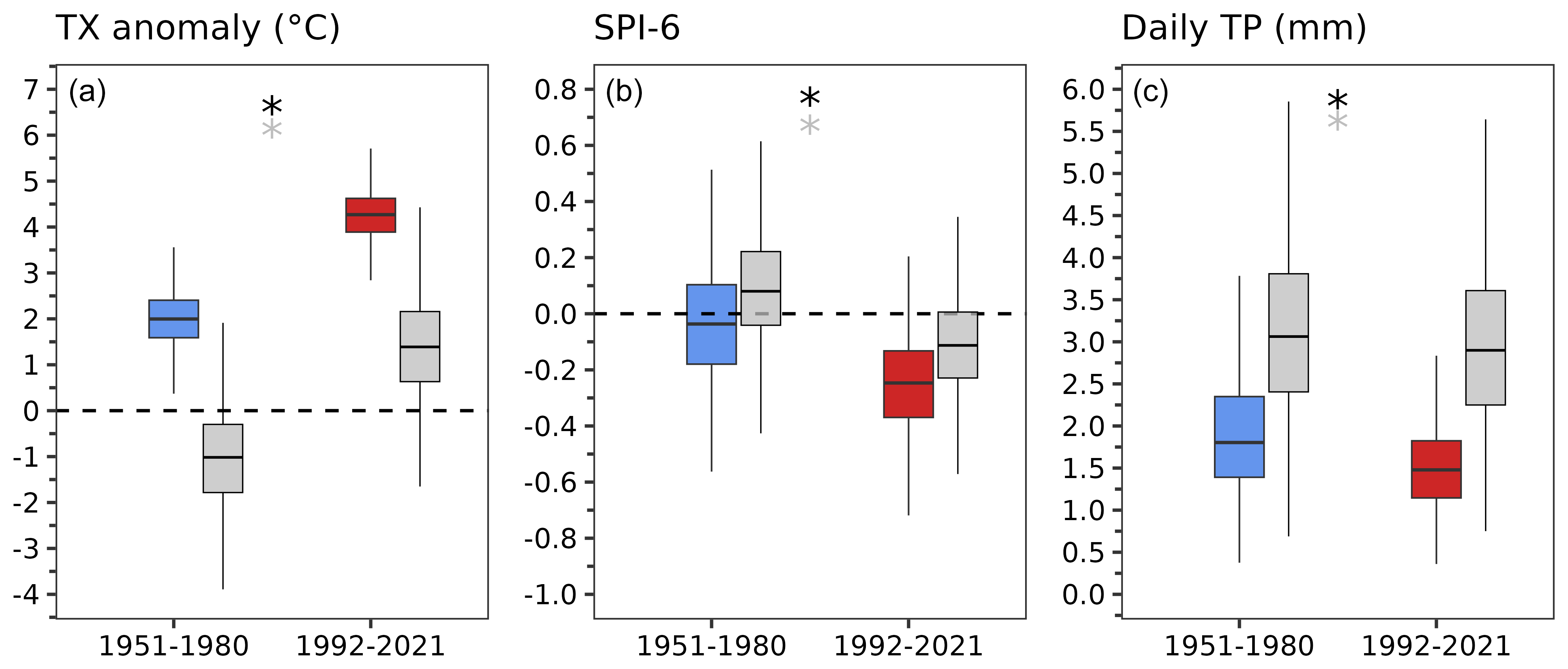 Figure 5Comparison of hydrometeorological variables in the Adige River basin for the periods 1951–1980 and 1992–2021. Boxplots of (a) daily maximum temperature anomalies (TX), (b) SPI-6, and (c) daily precipitation (TP), with flow-conditioned reconstructions (colored boxes) and unconditioned reconstructions (gray boxes). To assess the statistical significance of differences between the two periods, we applied the Mann–Whitney U test at 0.05 (∗) significance level. The absence of statistical significance is reported as “ns”.