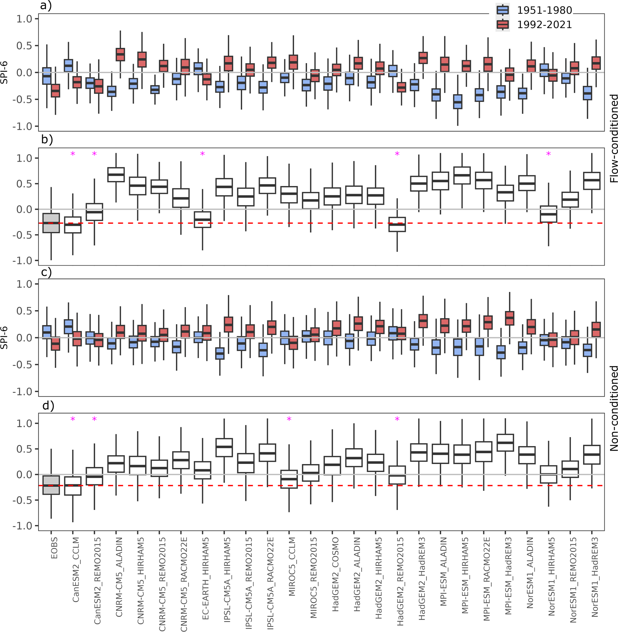 Figure 9Comparison of daily maximum temperature (TX) reconstructions for the periods 1951–1980 and 1992–2021 using flow-conditioned (panels a and b) and non-conditioned (panels c and d) approaches. Panels (a) and (c) display boxplots of temperature anomalies (°C) for individual models and the E-OBS dataset (grey shaded boxplot), with blue and red boxes representing the 1951–1980 and 1992–2021 periods, respectively. Panels (b) and (d) show the differences in temperature anomalies between the two periods (1992–2021 to 1951–1980) for each model, highlighting changes across the models. Pink markers in panels (b) and (d) indicate models with same sign of change as in observations (E-OBS, cyan marker), while the red dashed lines indicate the median value for each E-OBS boxplot in (b) and (d). The complete names of the models are detailed in Table A1.