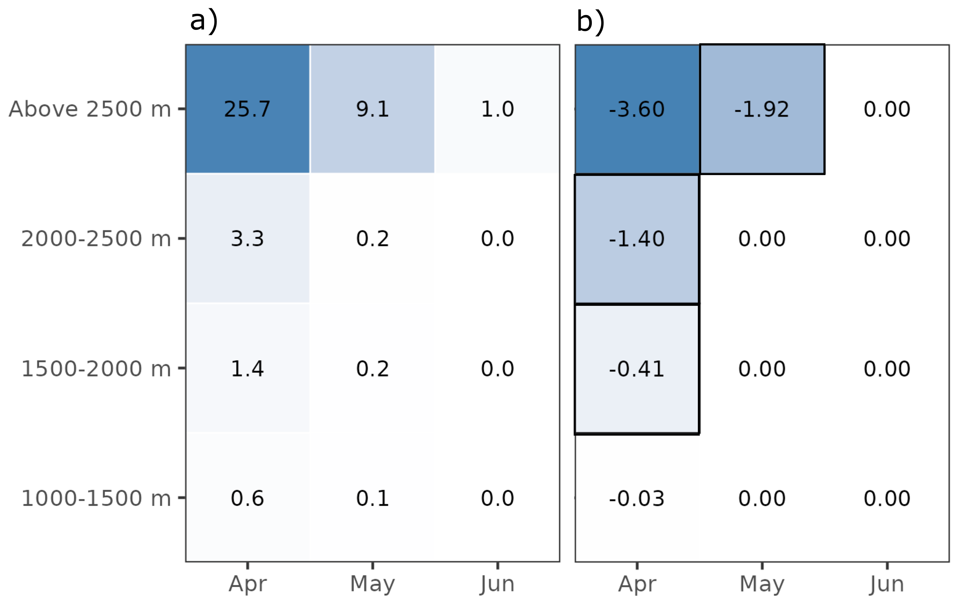 Figure A3(a) Average snow cover percentage for the period 2000–2023 by elevation band in the Adige catchment, derived from MODIS data. (b) Decadal trends in snow cover percentage over the same elevation bands. Cells highlighted with a black border denote trends that are statistically significant at the 95 % confidence level.