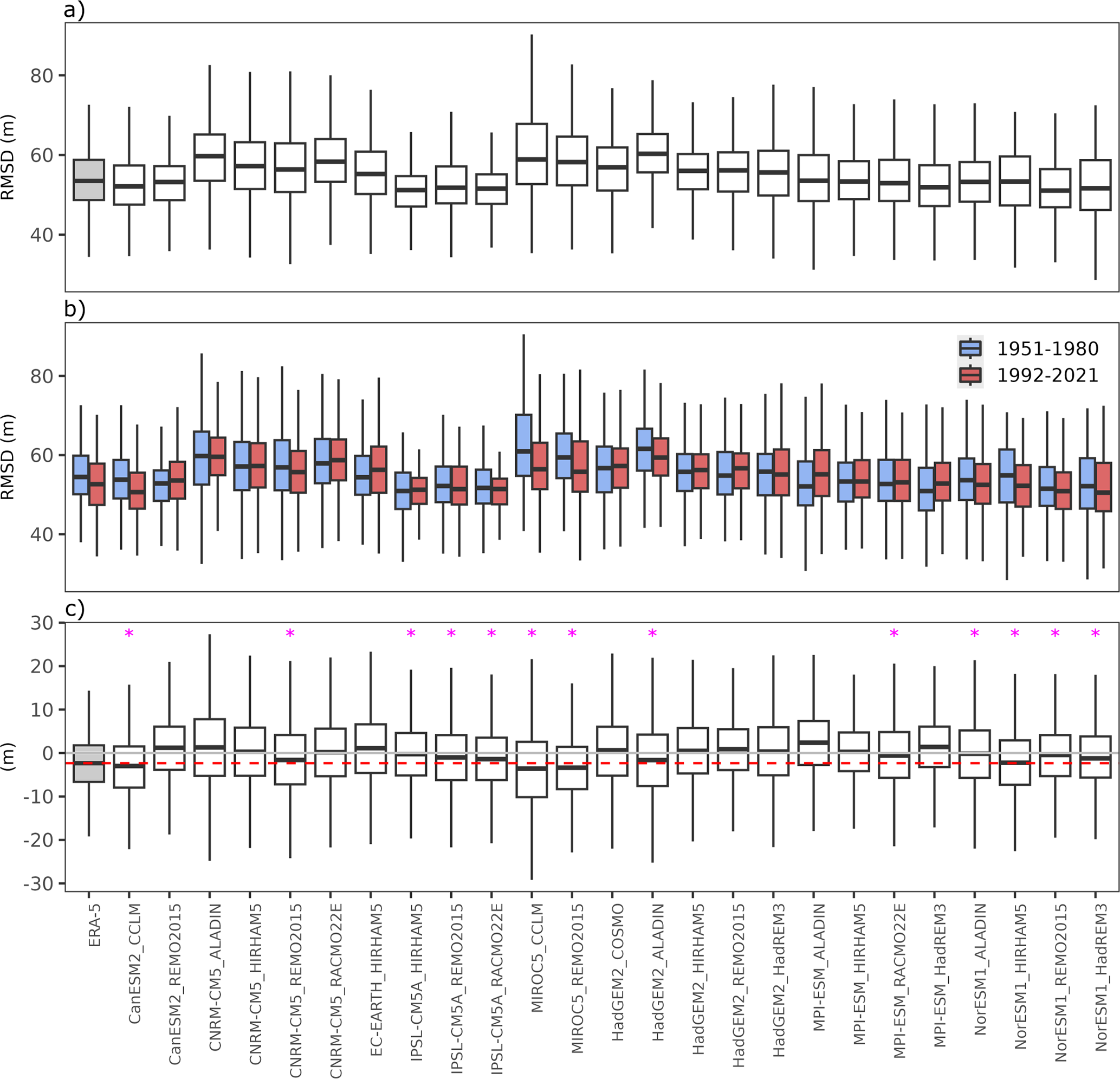 Figure A7Comparison of analogue quality for geopotential height at 500 hPa (Z500) reconstructions for the periods 1951–1980 and 1992–2021. (a) displays boxplots of Root Mean Square Deviation (RMSD) values for the entire 1951–2021 period across individual models and the ERA5 dataset (grey shaded boxplot); (b) compares RMSD values for the periods 1951–1980 (blue) and 1992–2021 (red), showing analogue quality across models; (c) illustrates the differences in RMSD between the two periods (1992–2021 to 1951–1980) for each model, highlighting changes in analogue quality. Pink markers in the bottom panel indicate models with same sign of change as in observations. The complete names of the models are detailed in Table A1.