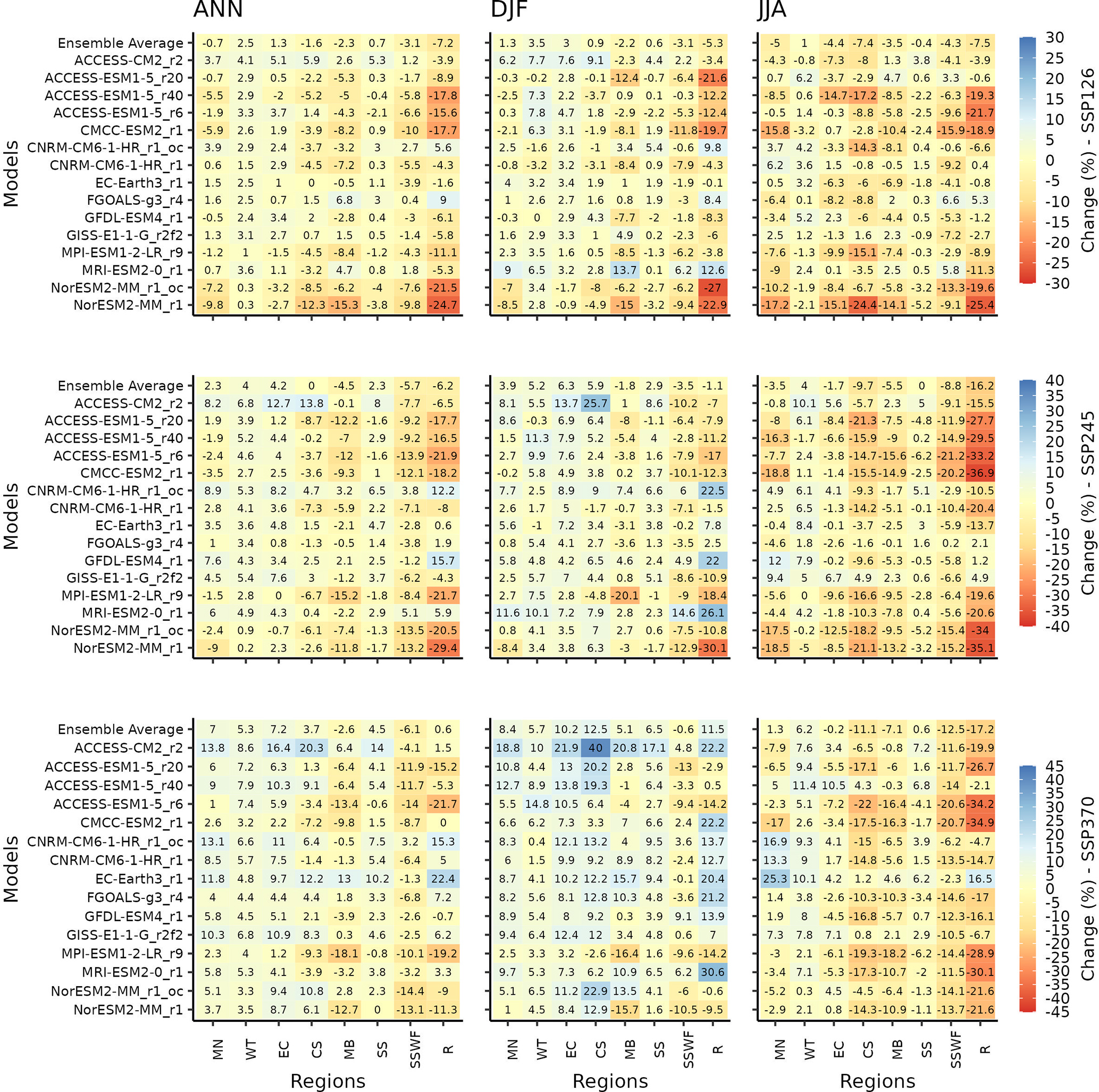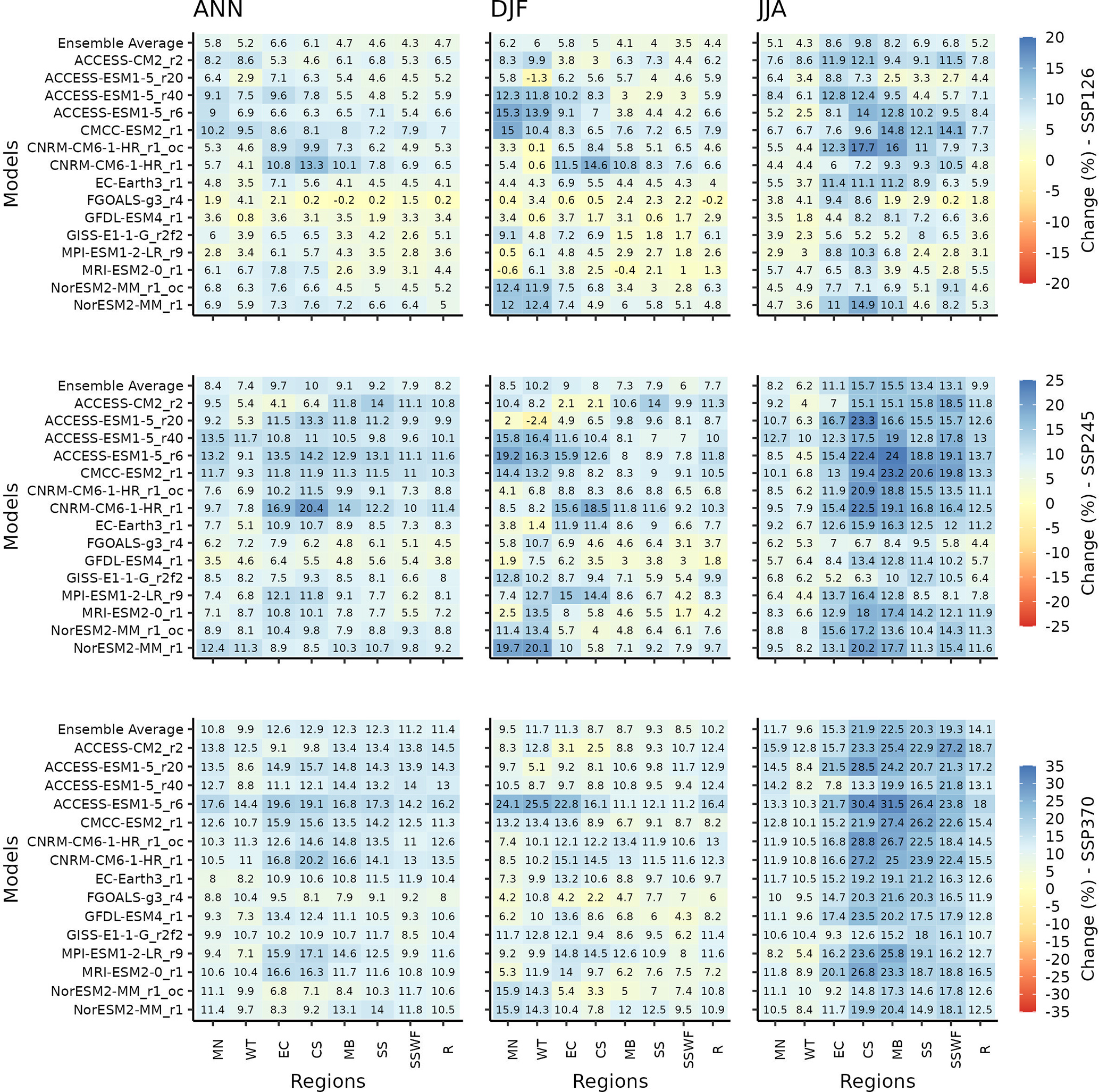 Figure 6Heatmaps for climate change signal (percentage difference between future and present) from 1995–2014 to 2080–2099 for AET across annual (ANN), summer (DJF), winter (JJA) seasons in 8 NRM regions in Australia. Projected changes from QldFCP-2 under emissions scenarios (SSP126, SSP245 and SSP370) are shown for individual models and ensemble mean in each row.