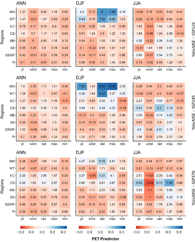 Figure 9Heatmaps showing the importance (%IncMSE) of PET predictors (precipitation – pr, wind speed – wind, solar radiation – rad, maximum temperature – max and minimum temperature – min) across annual (ANN), summer (DJF), winter (JJA) seasons. The random forest model is applied to eight NMR regions and three scenarios for the climate change signal (from 1995–2014 to 2080–2099). The rows represent eight NRM regions, and columns represent the five predictors.
