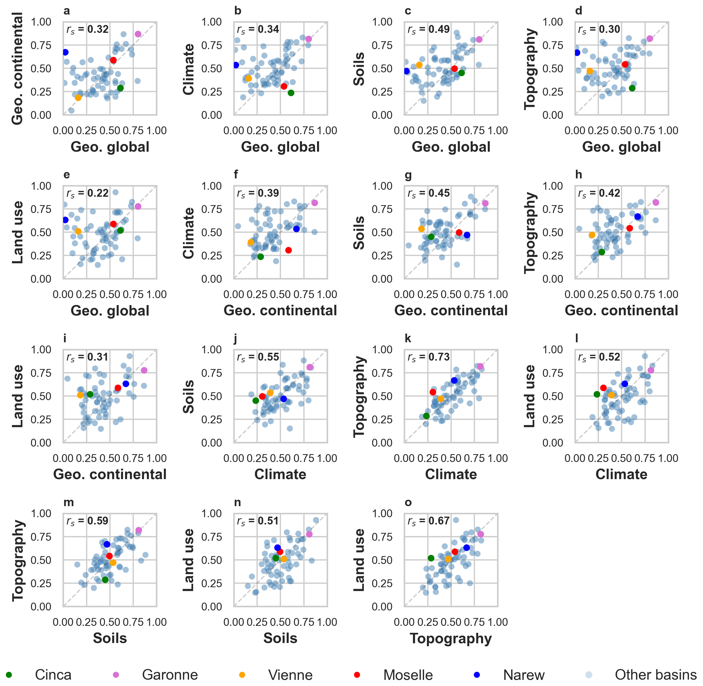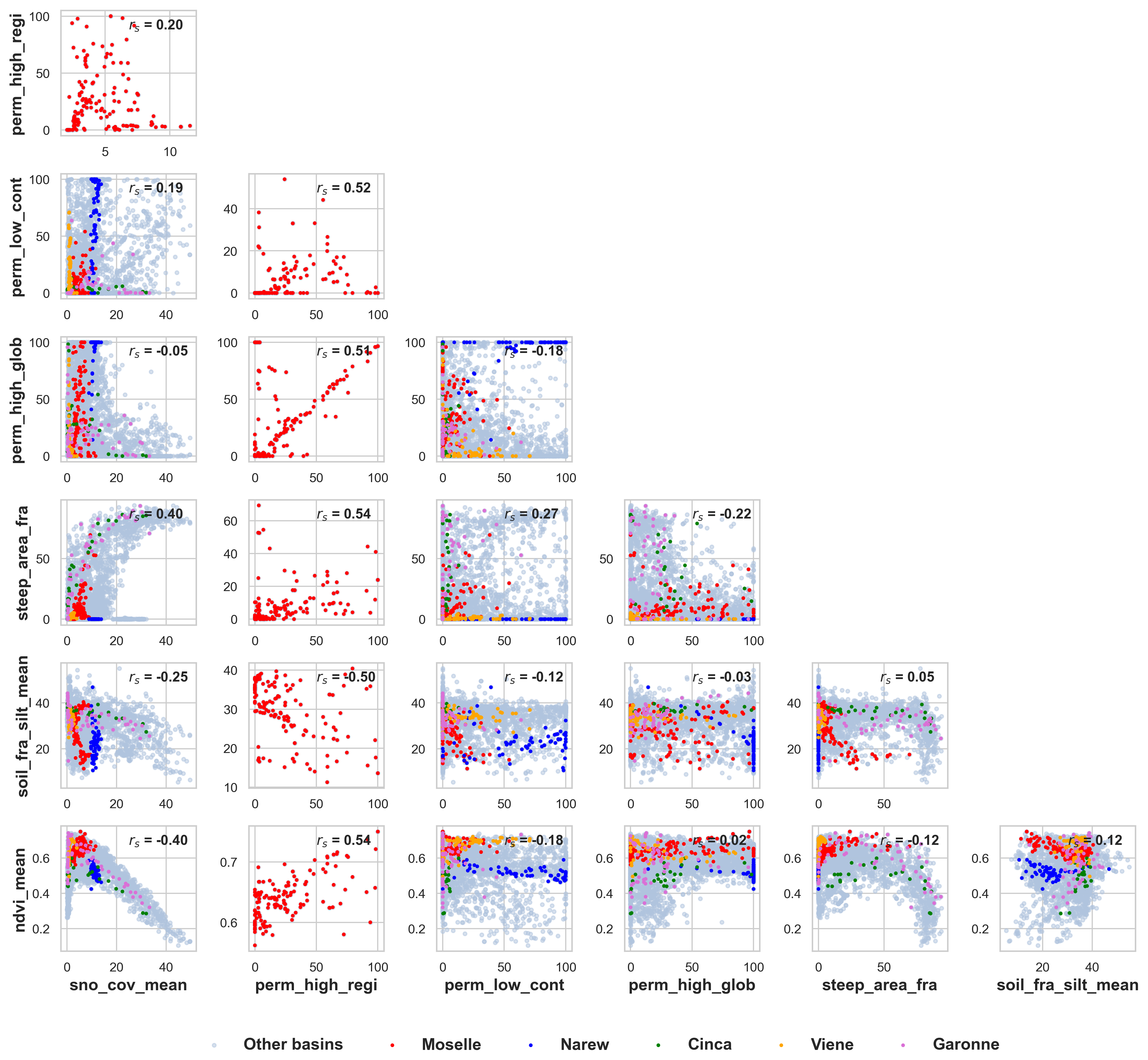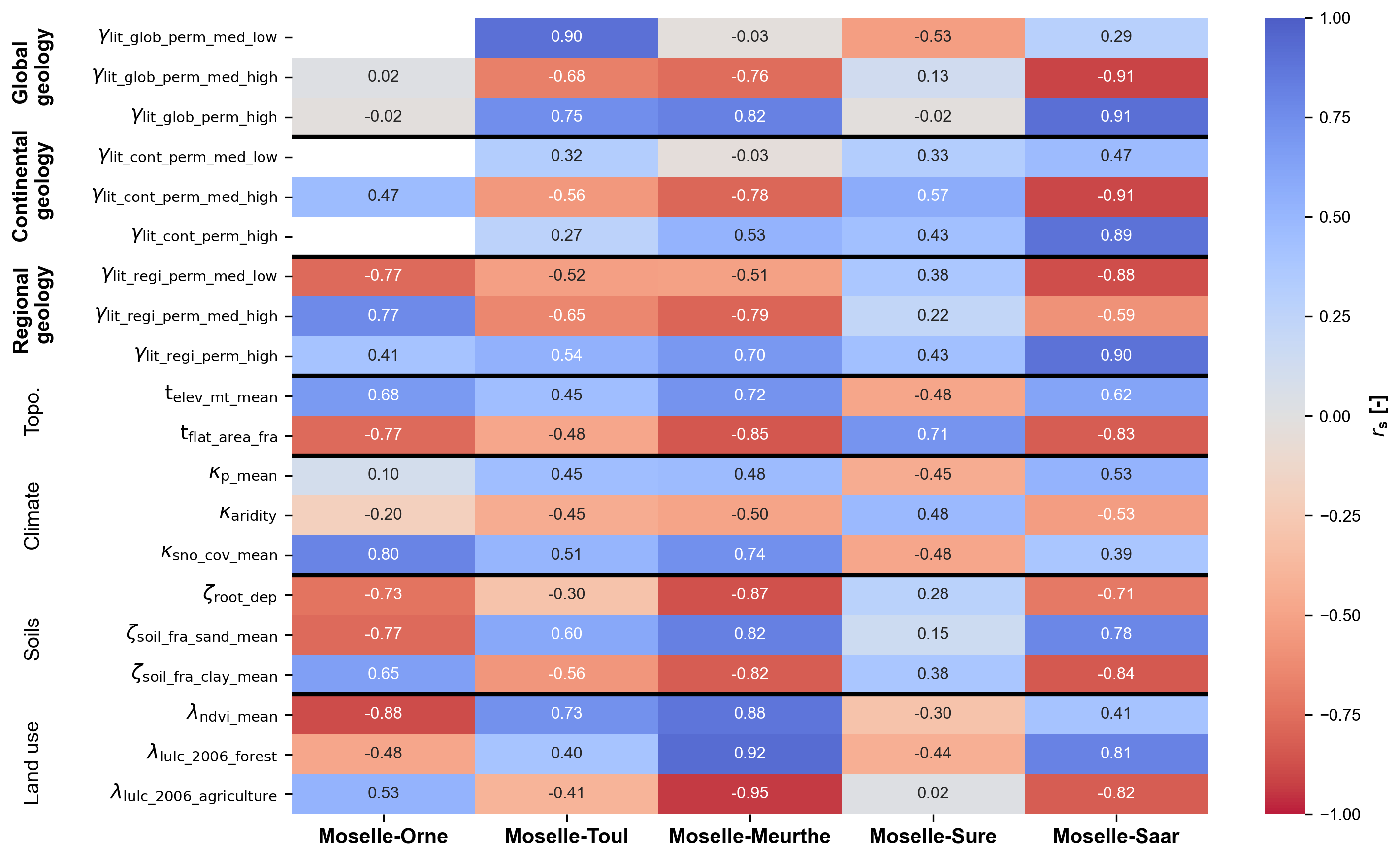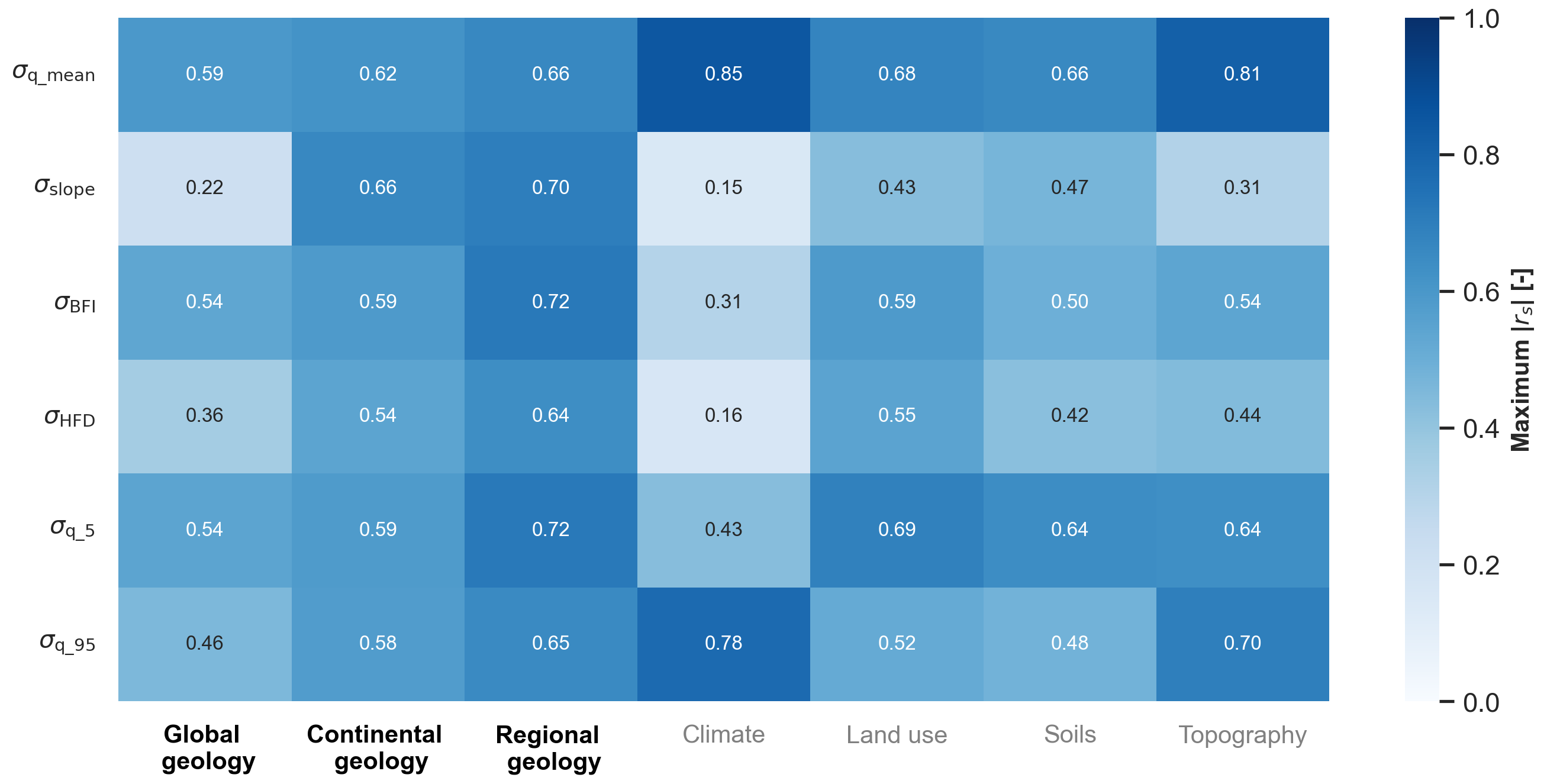 In this study, we conducted an exploratory statistical analysis to identify dominant climate or landscape attributes influencing streamflow generation across different scales. This was done based on the Spearman correlation coefficient (rs) between each catchment attribute (listed in Table 4) and each streamflow signature (Table 3). To analyze the impact of different geological maps, the analysis was performed separately using data of the corresponding attributed from each map – global, continental, and regional. This approach allows us to evaluate the influence of geological data level of detail on correlation outcomes and assess whether observed correlations correspond to hydrological expectation and previous literature.