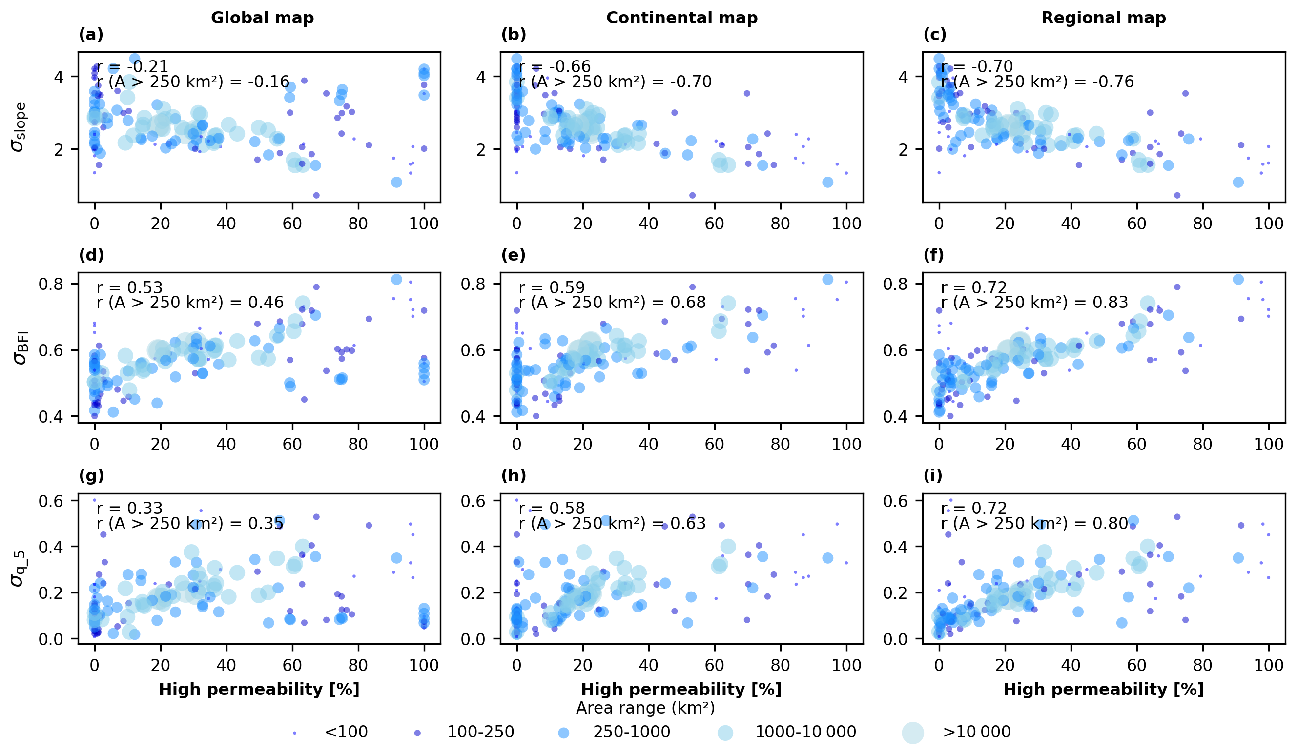 Consistency of correlations with physical understanding: As map detail increases, we expect the correlations to become progressively more consistent with physical understanding. For example, the baseflow index (σBFI) is expected to show positive correlations with high-permeability geological attributes, as high bedrock permeability favors groundwater flow, which facilitates baseflow (Bloomfield et al., 2021; Fenicia and McDonnell, 2022). We also anticipate that, because of this physical consistency, correlations will become less variable across different regions.