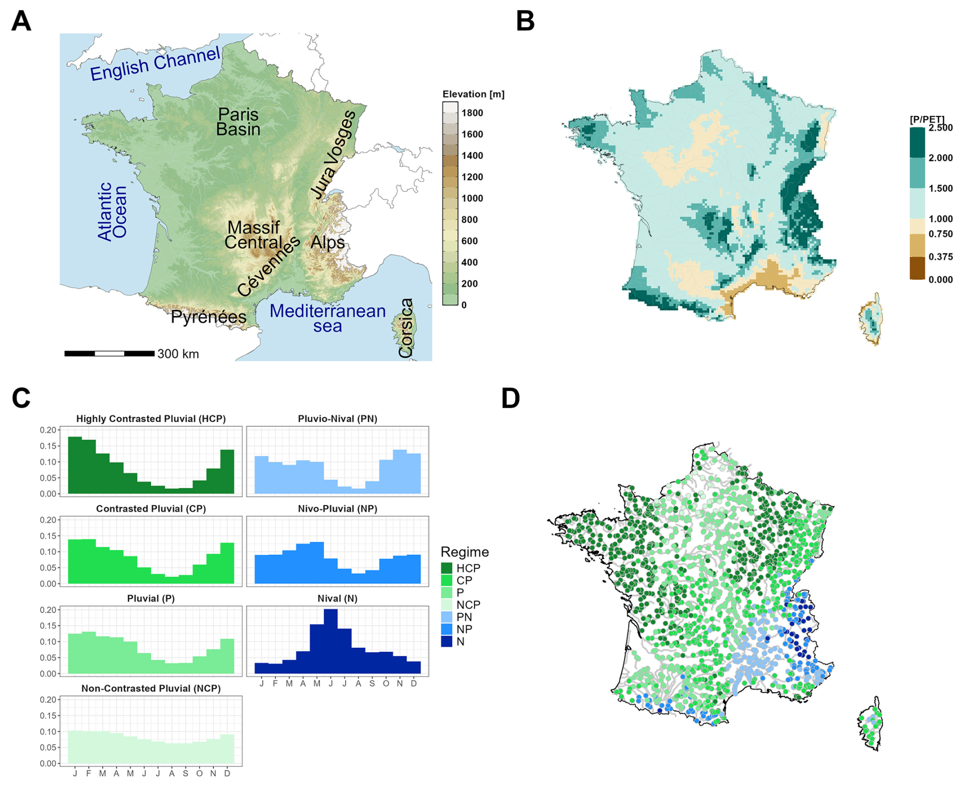 Rainfall-dominated regimes present a seasonality mostly derived from the seasonality of precipitation and evapotranspiration losses, with high flows in winter and low flows in summer. The winter/summer contrast depends on the catchment. It is very large in the Western and northeastern parts of France, where catchments have a low storage capacity, large in the North and the South-West, moderate in the Center and in the East, and very small in regions where river streamflows are sustained all year long by important aquifers (e.g. in the Paris Basin region). This diversity is represented by four regimes: highly contrasted pluvial (HCP), contrasted pluvial (CP), pluvial (P), and non-contrasted pluvial (NCP). Different hydrological responses to climate change are expected according to these regimes (e.g., Sauquet et al., 2024).