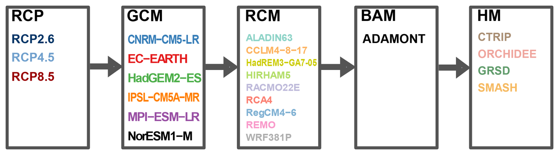 Figure 2Modeling chain: Emission scenarios (RCP), Climate models (GCM, RCM), Bias Adjustment Model (BAM) and Hydrological Models (HM) considered in this study.