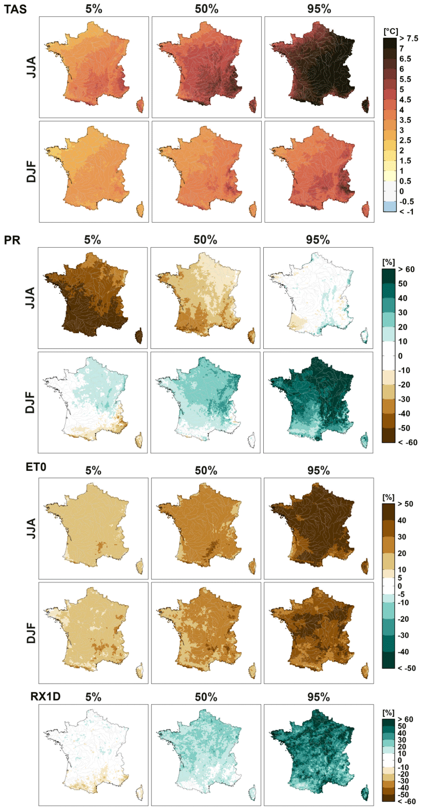 We carried out our analyses for a selection of indicators representative of projected changes in climate and hydrology. Indicators considered in the present work are surface air temperature (TAS), total precipitation (PR), reference evapotranspiration (ET0) at a seasonal scale (summer and winter), annual maximum daily precipitation (RX1D), annual minimum monthly flow (QMNA), mean annual daily discharge (QA), and annual maximum daily discharge (QJXA).