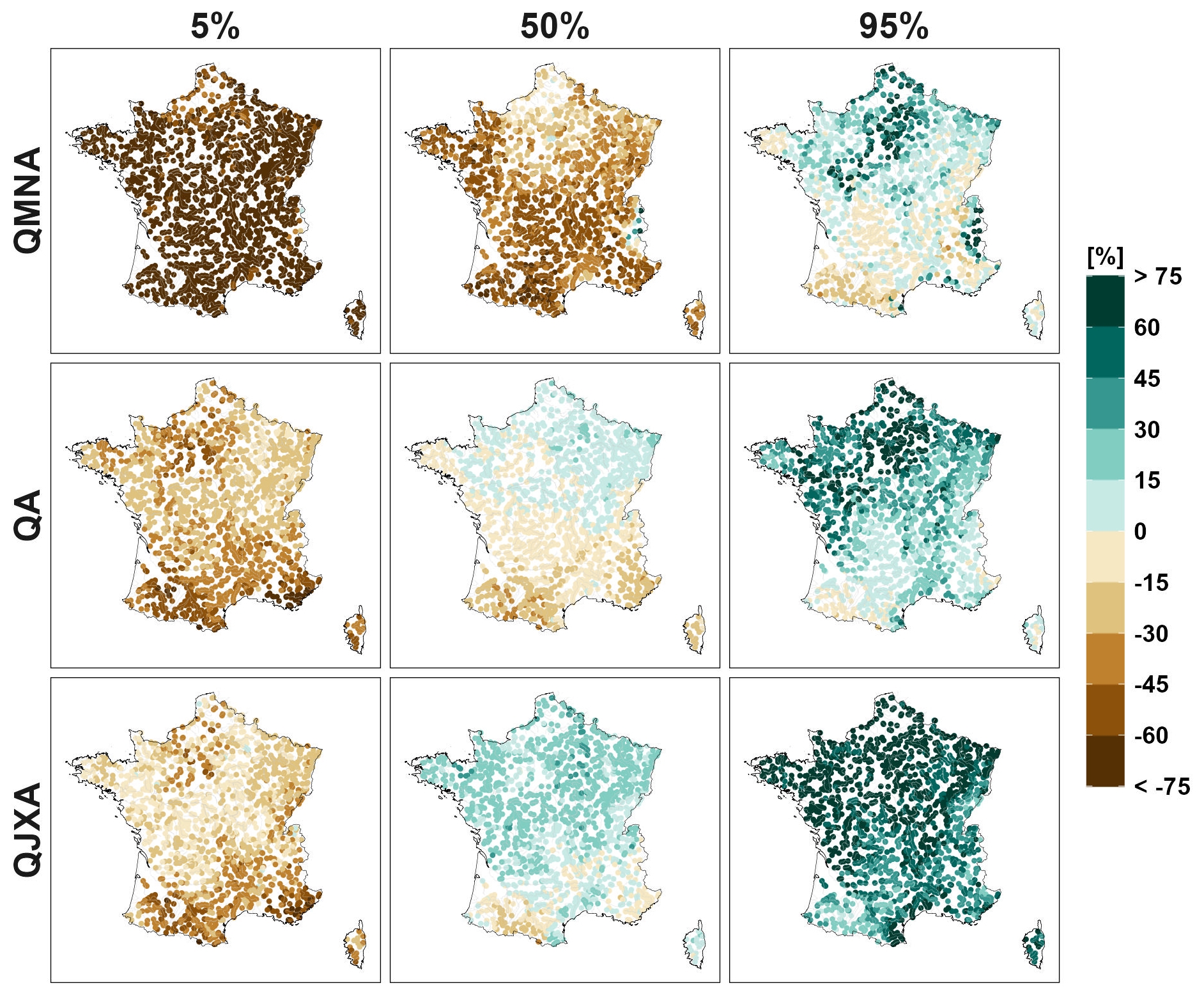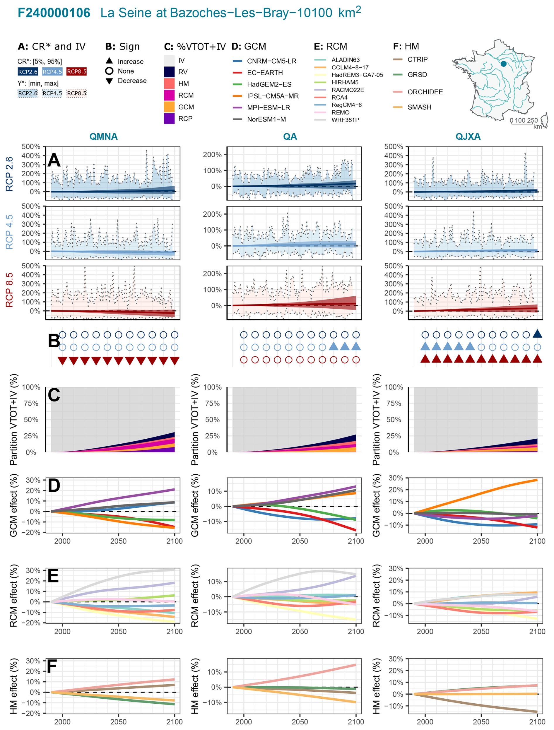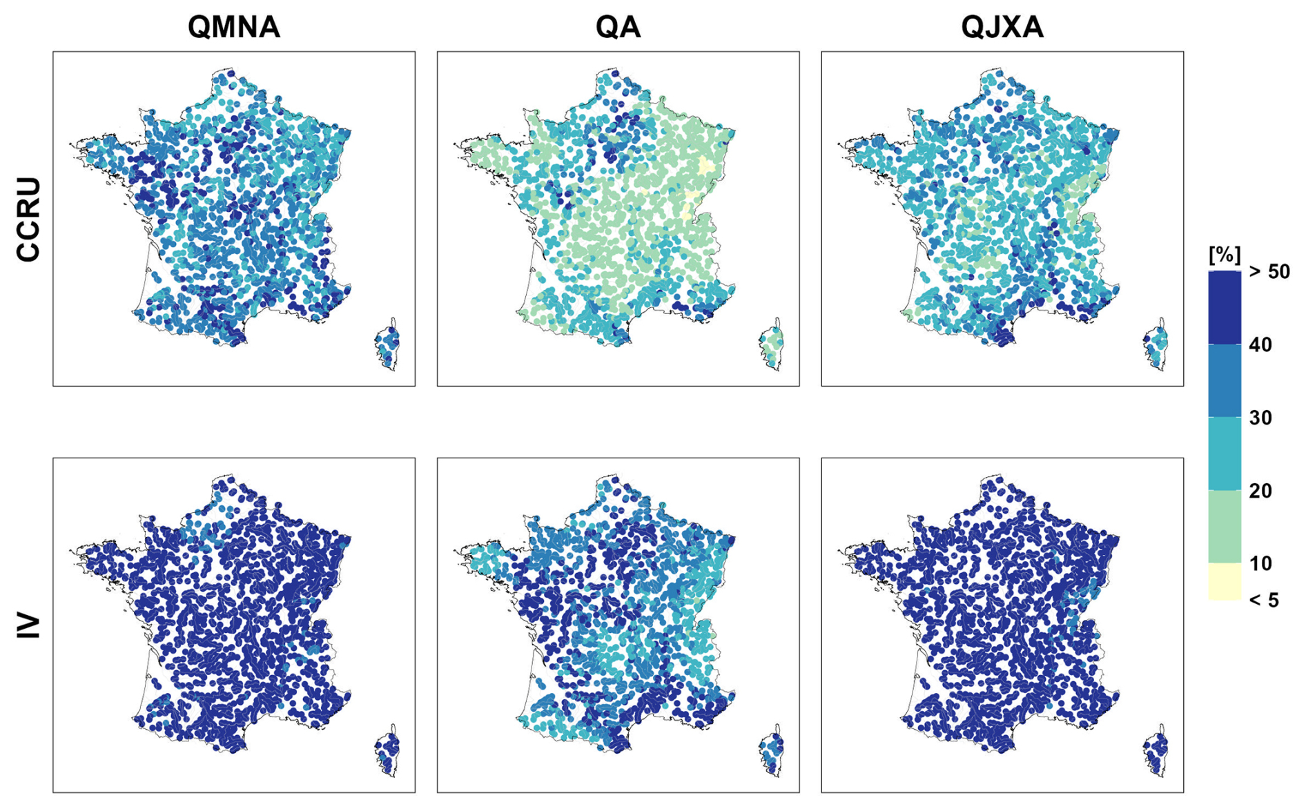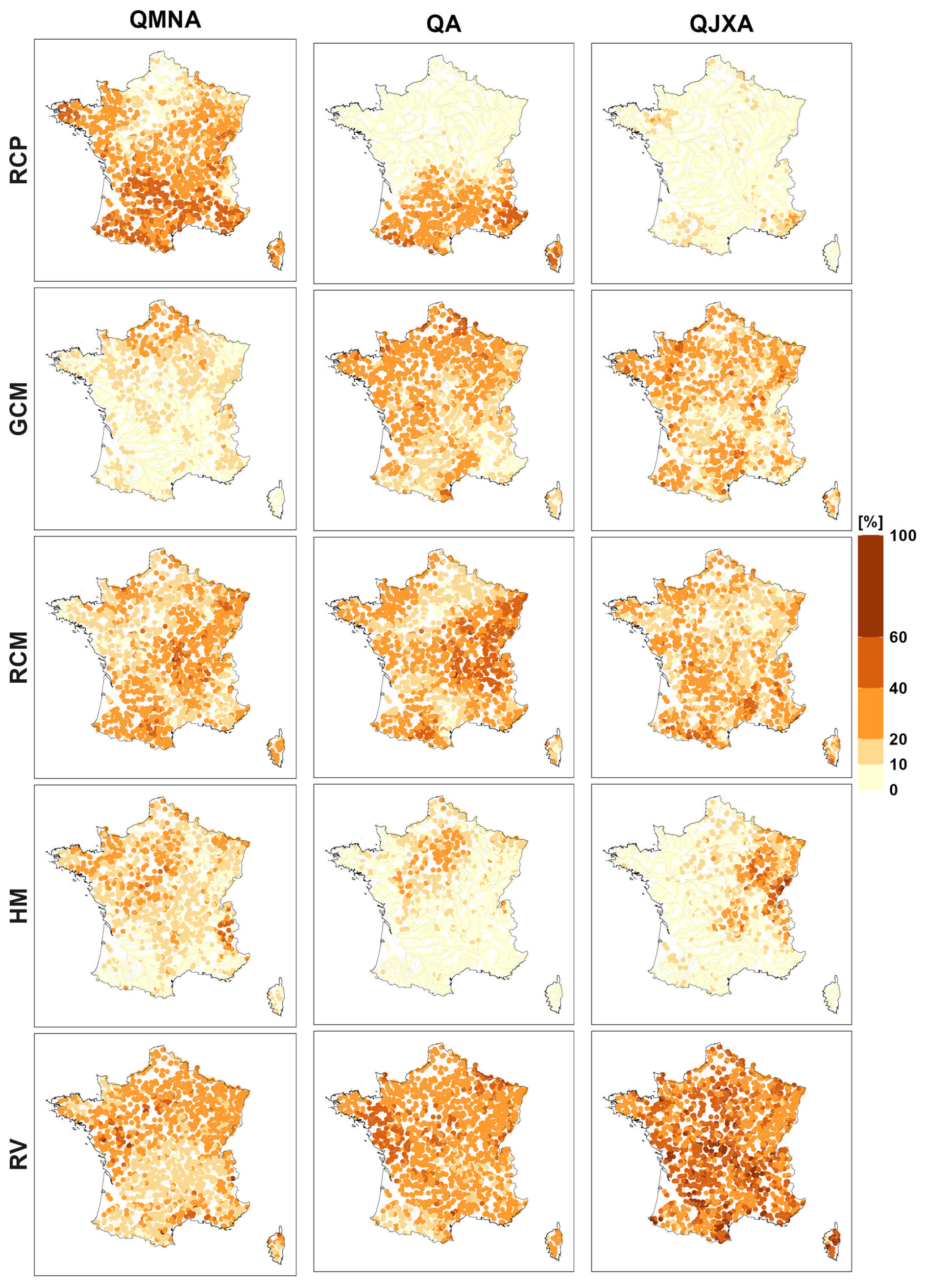 In this section, we first present results for climate indicators obtained from the MME composed of 36 Explore2 transient climate projections by applying QUALYPSO to each of the 8981 grid points covering France. We next show the results for three hydrological indicators, namely the annual minimum monthly flow (QMNA), the mean annual discharge (QA), and the annual maximum daily discharge (QJXA). These indicators can be considered representative of low flows, mean discharge, and high flows, respectively. QUALYPSO is applied to the MME for each of the 1735 simulation points available for the four HMs. In this study, each MME is thus composed of 144 transient hydrological projections obtained with the four HMs forced by the 36 climate projections. We present the changes projected at the end of the century (2071–2099) with respect to the reference period 1976–2005. For each indicator, we show the mean projected changes and the inter-model dispersion with the scenario RCP8.5 which corresponds to greater changes in climatic and hydrological variables. This section then shows how IV compares to CCR uncertainty and what climate changes are projected for lower emission scenarios RCP2.6 and RCP4.5.