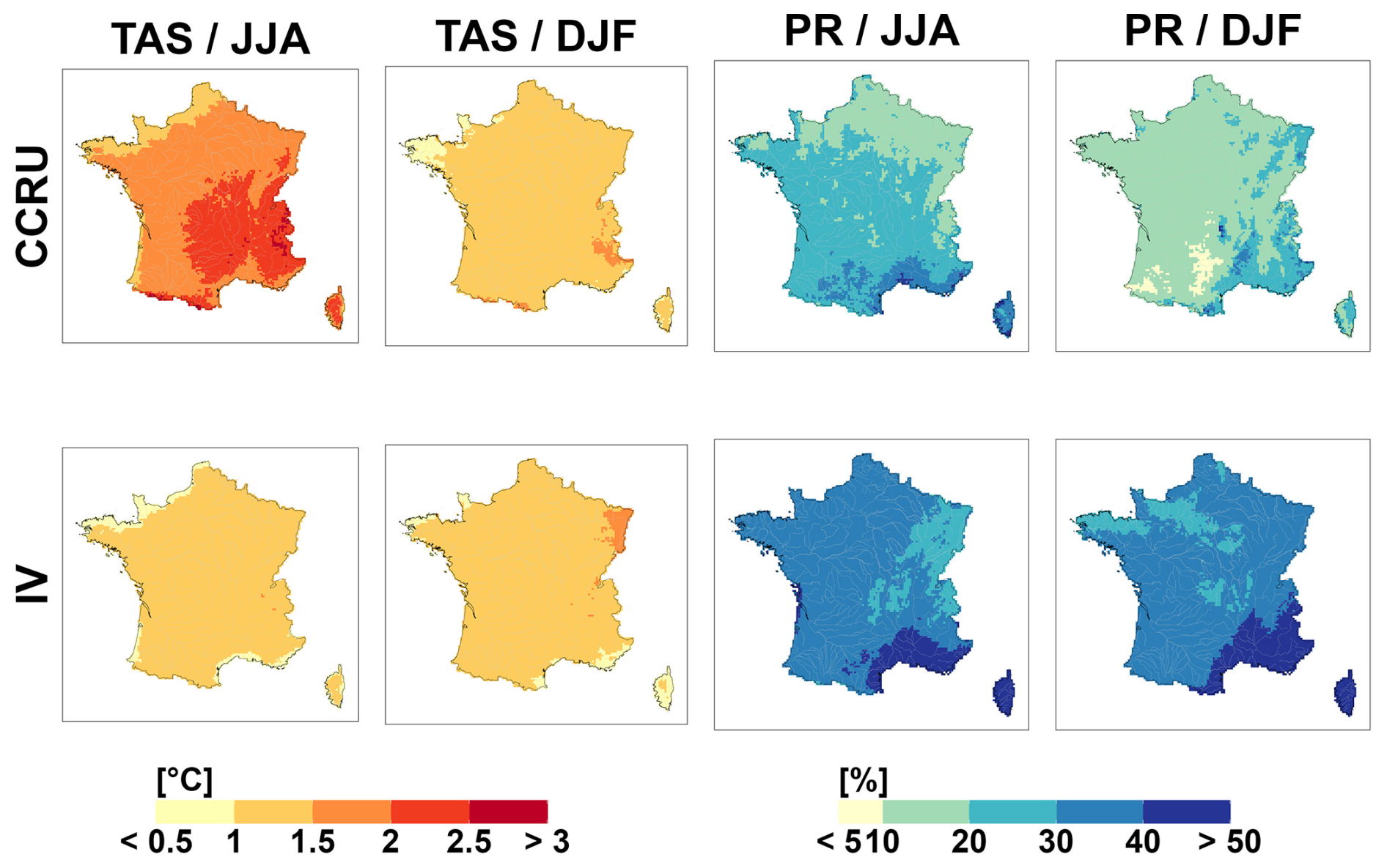 In summer, precipitation is projected to significantly decrease, from −10 % to −40 % for the median CCR depending on the region. Although there is considerable dispersion among the projections, they largely agree on the direction of change. However, a few exceptions exist, notably in the Rhône River valley and some eastern regions, where some projections indicate a slight increase. The most extreme projections lead to very large decreases, −60 % on average over France and up to −85 % in the South.