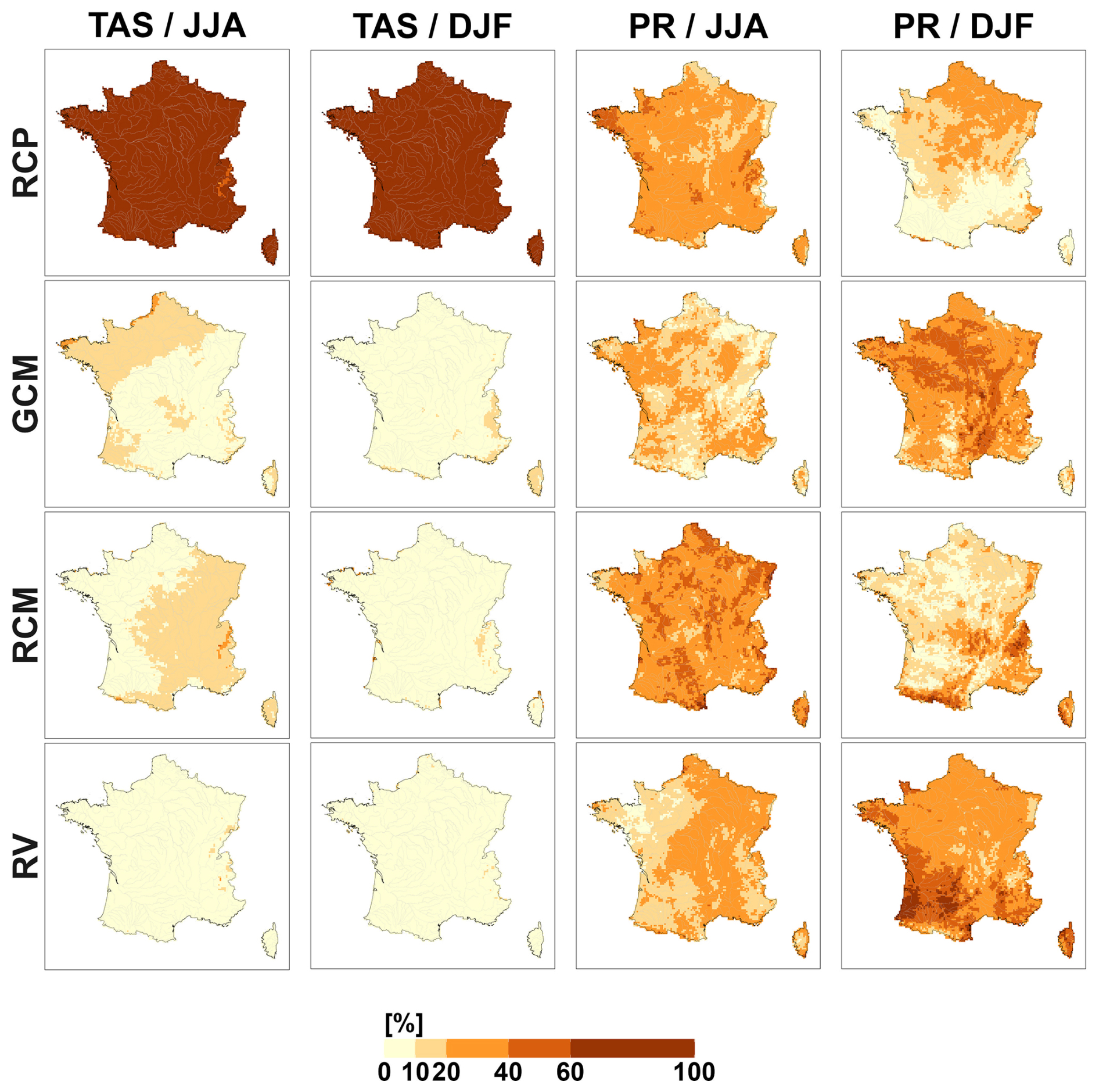 The percentage variance contribution to CCR uncertainty variance (in %) of each CCR uncertainty source (scenario, GCM, RCM, HM) and unexplained CCR uncertainty (residual variability, RV). This indicates the relative importance of the different sources and the dominant ones.
